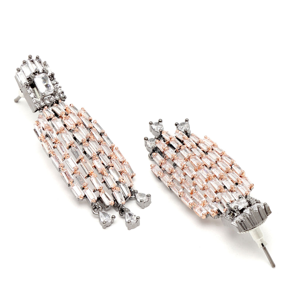 White contemporary drop earrings, Rose Gold-Plated Gunmetal, has artificial stones. Secured with a post and back.
