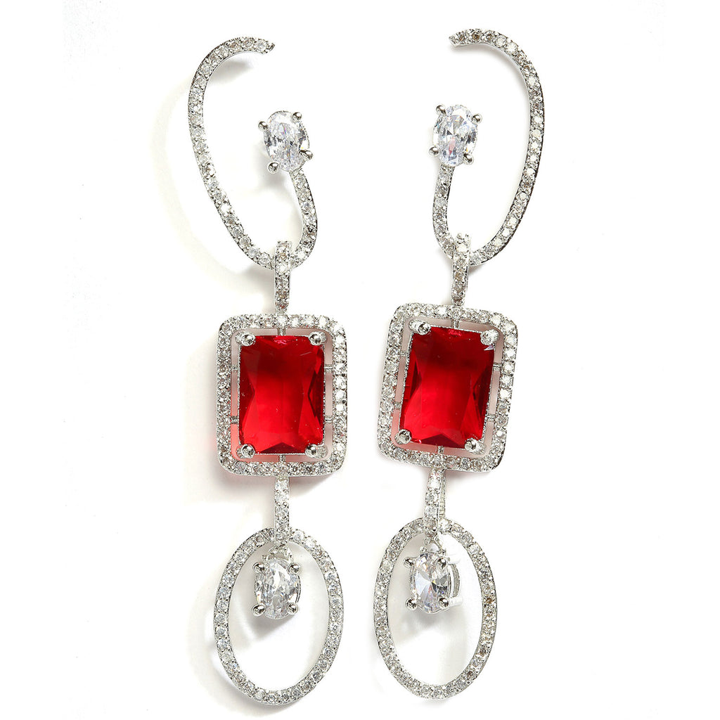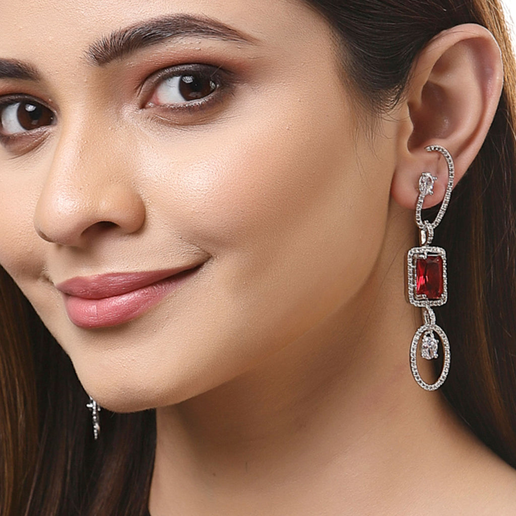 Red Geometric Shaped Rhodium-Plated with Silver-Tone Drop Earrings