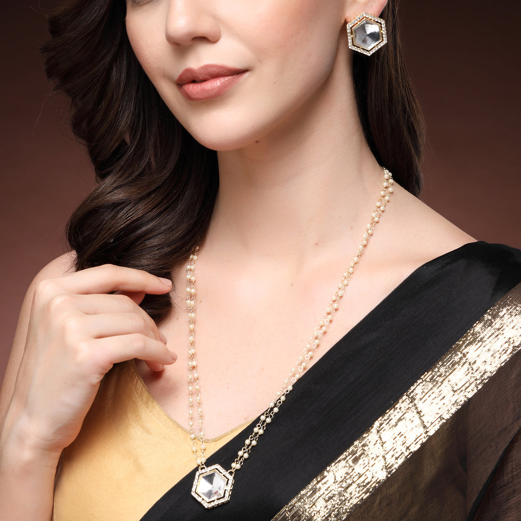 Elegant Design: Gold-plated necklace set featuring White pearls and kundan, designed in a beautiful 2-layered style for a sophisticated look.