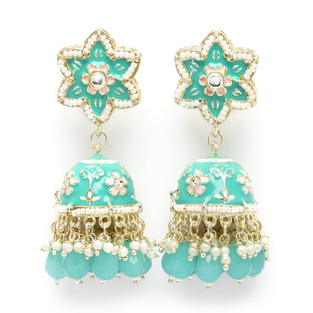 Gold-Plated Sky Blue & White Star Shaped Enamelled Jhumka Earrings, has Kundan & Pearls studded secured with Post and Back closure.
