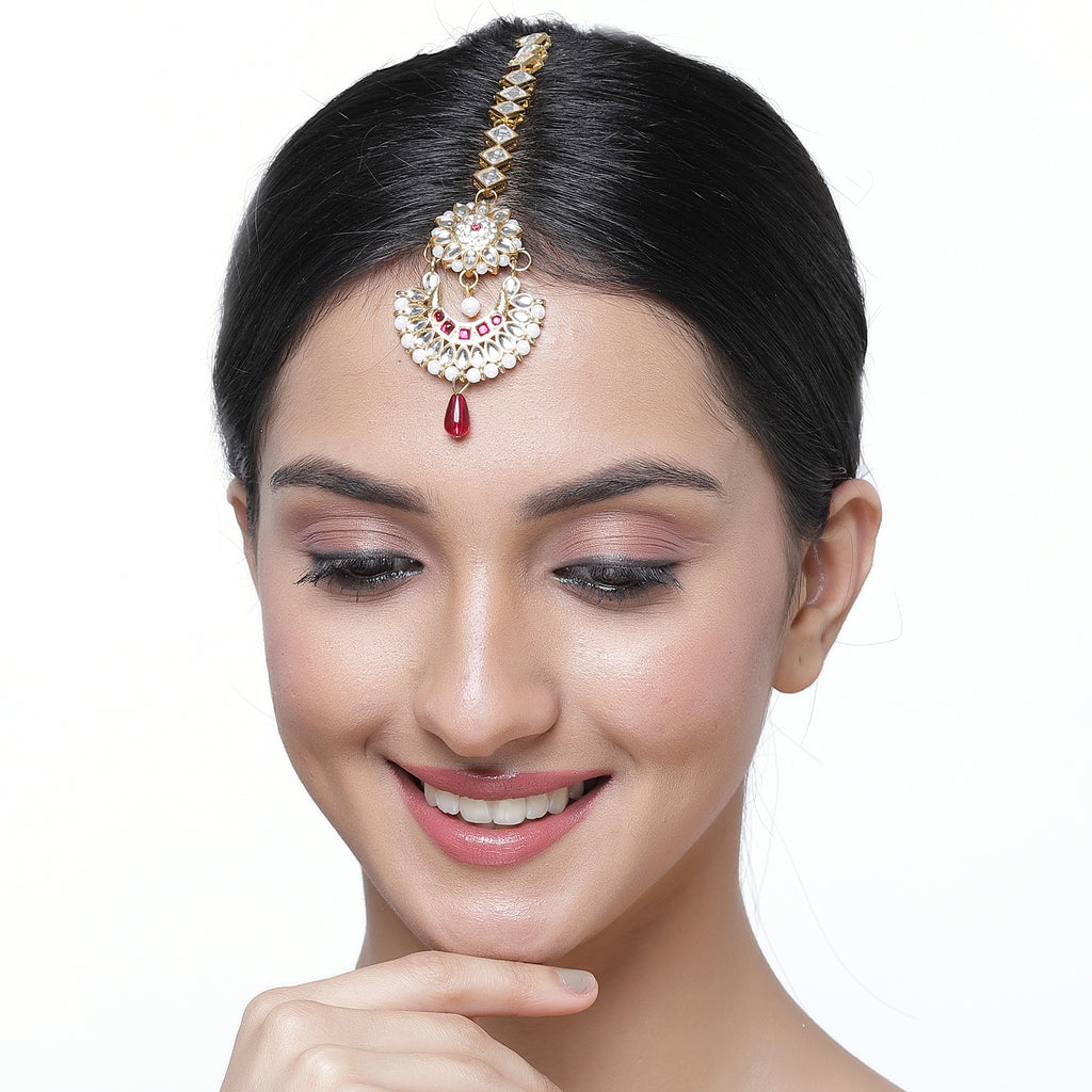 • Elegant Design: This gold-plated Kundan Maang Tikka with pink beads and pearl details adds a regal touch to your ethnic wear.