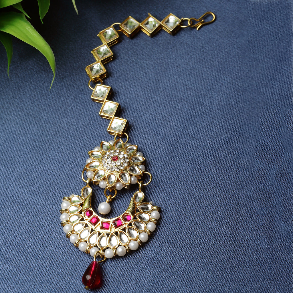 Gold-Plated Chandbali-Style White & Pink Kundan Pearl studded Maang Tikka