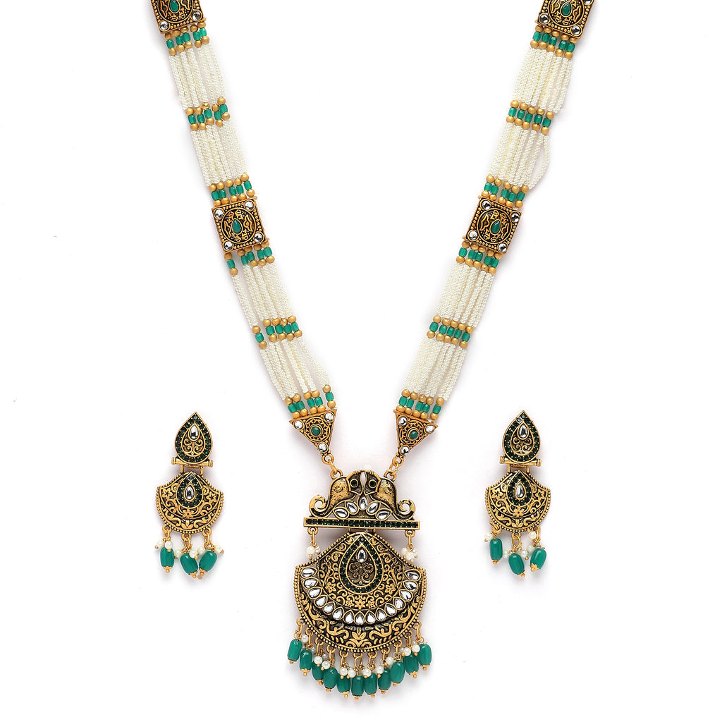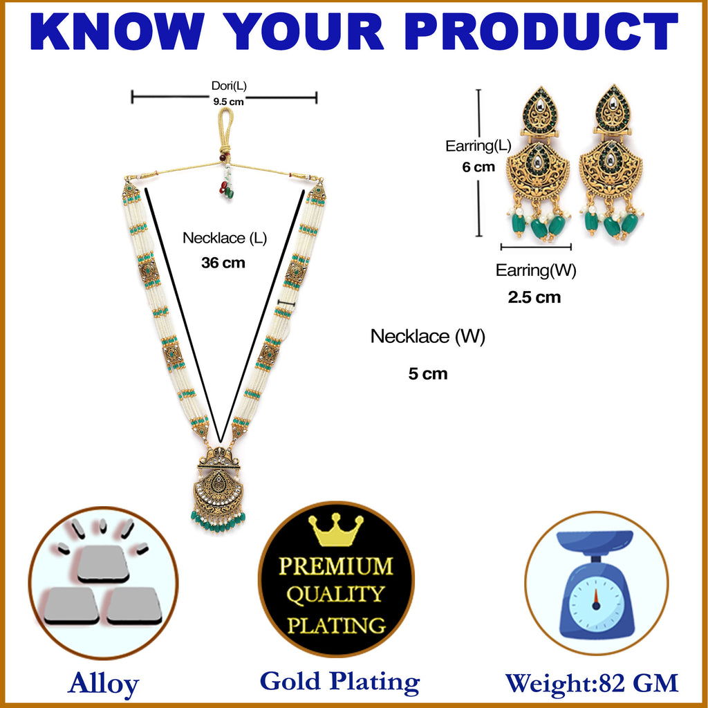 This jewellery set consists of a necklace and a pair of earrings. Gold-Plated Green & White Cubic Zirconia Studded & Beaded Long Meenakari Necklace, has secured with Adjustable Drawstring closure. A pair of matching drop earrings, each secured with a post and back closure.