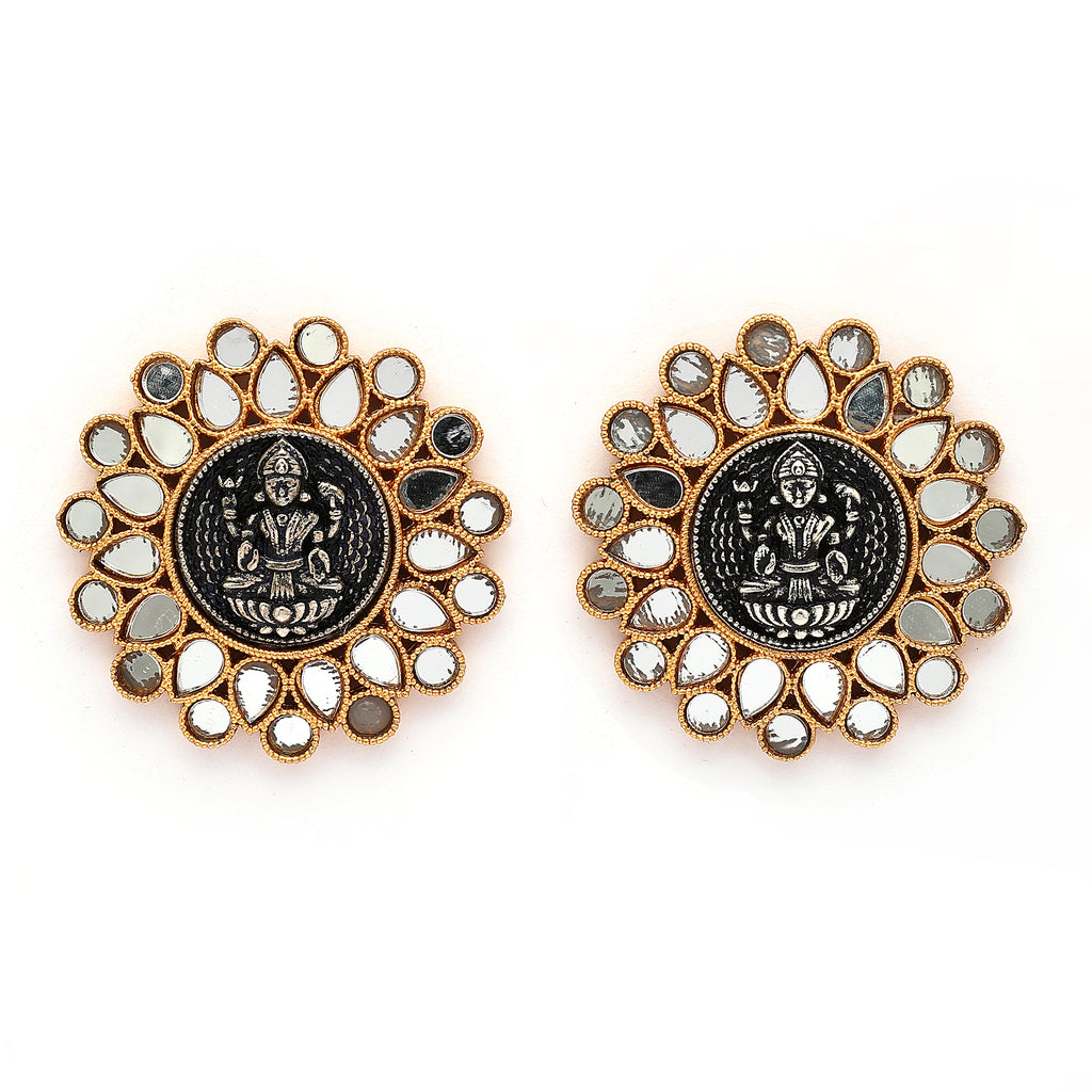 Elegant Design: This Gold plated dual toned Temple coin stud earrings detail with Mirror adding a touch of elegance to any look.