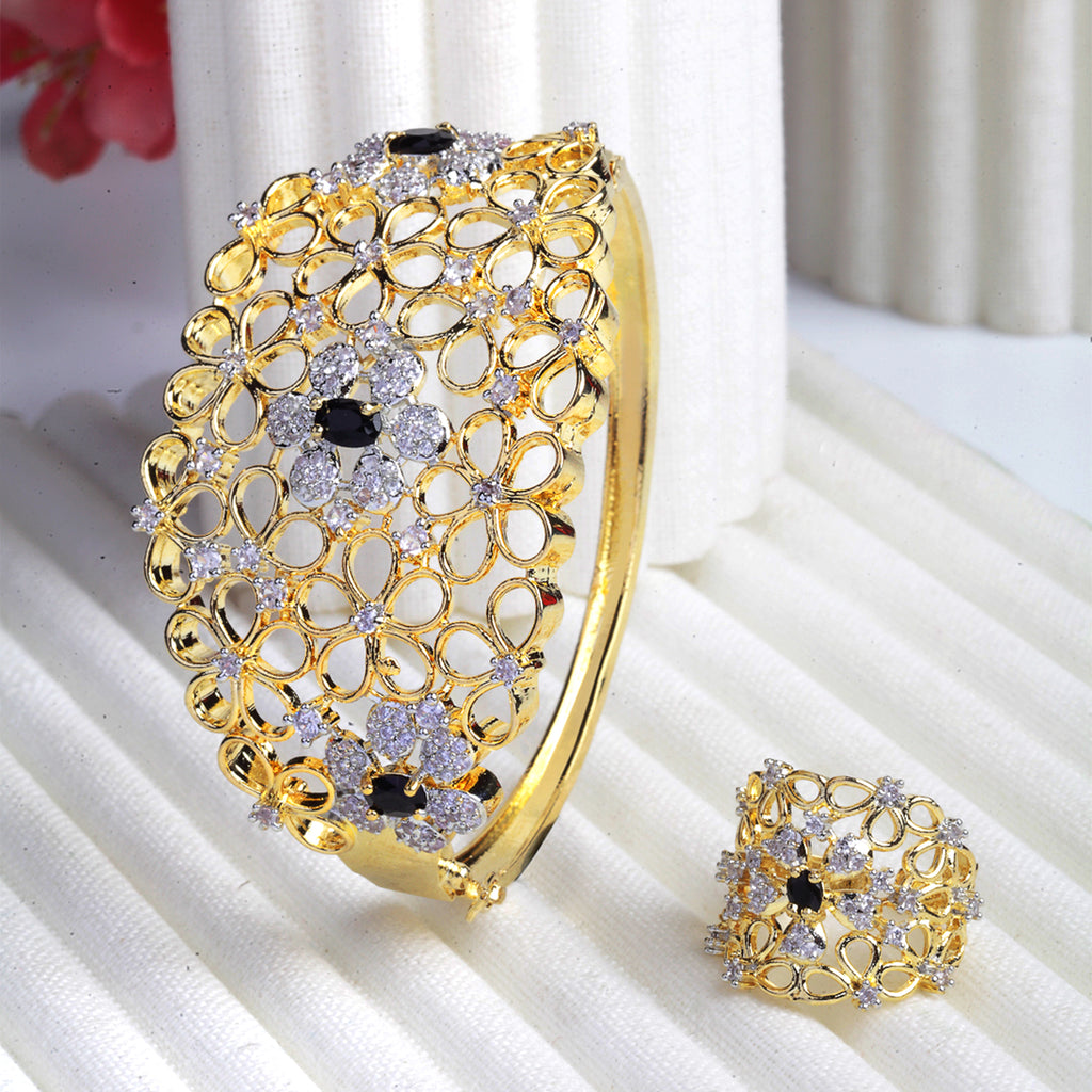 Gold-Plated Floral Design Black & White American Diamond Studded Bangle & Ring Set