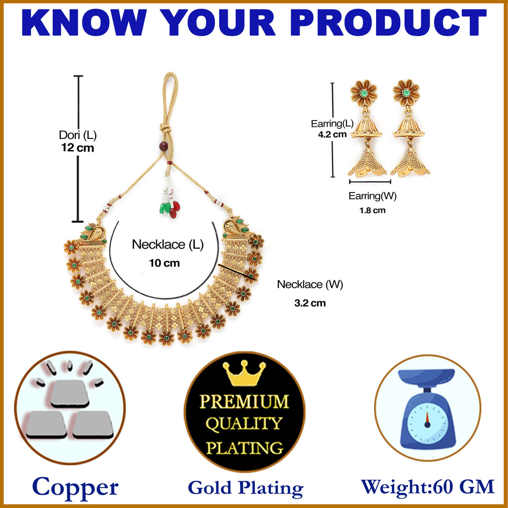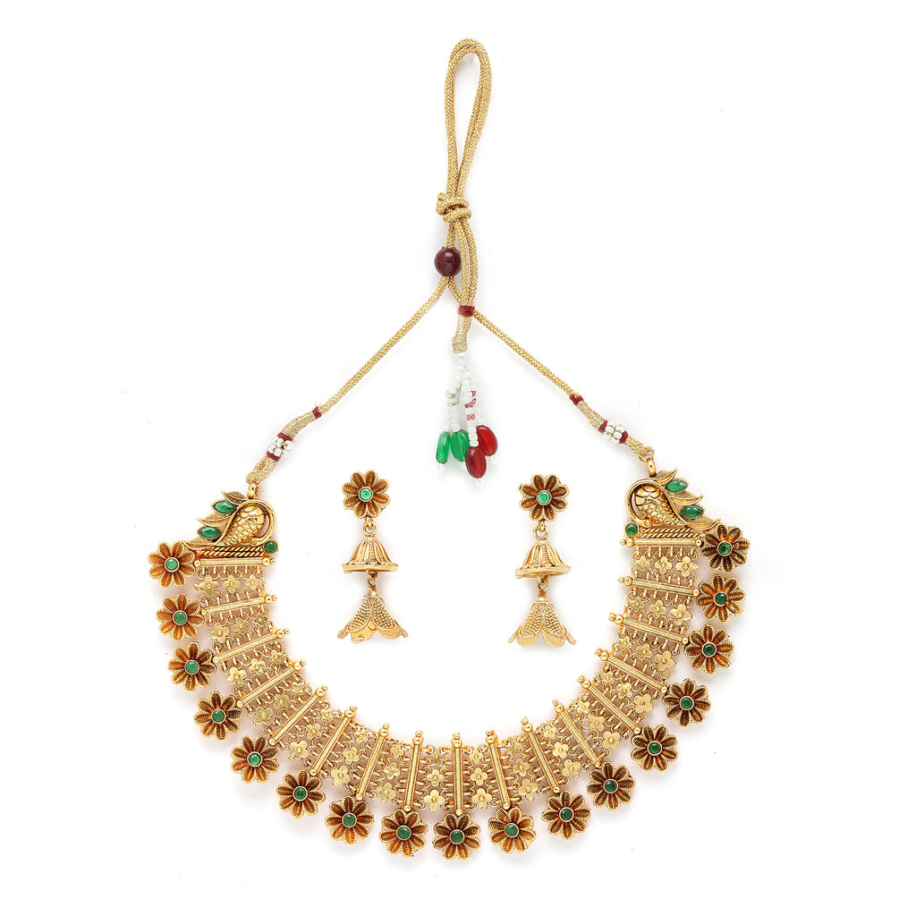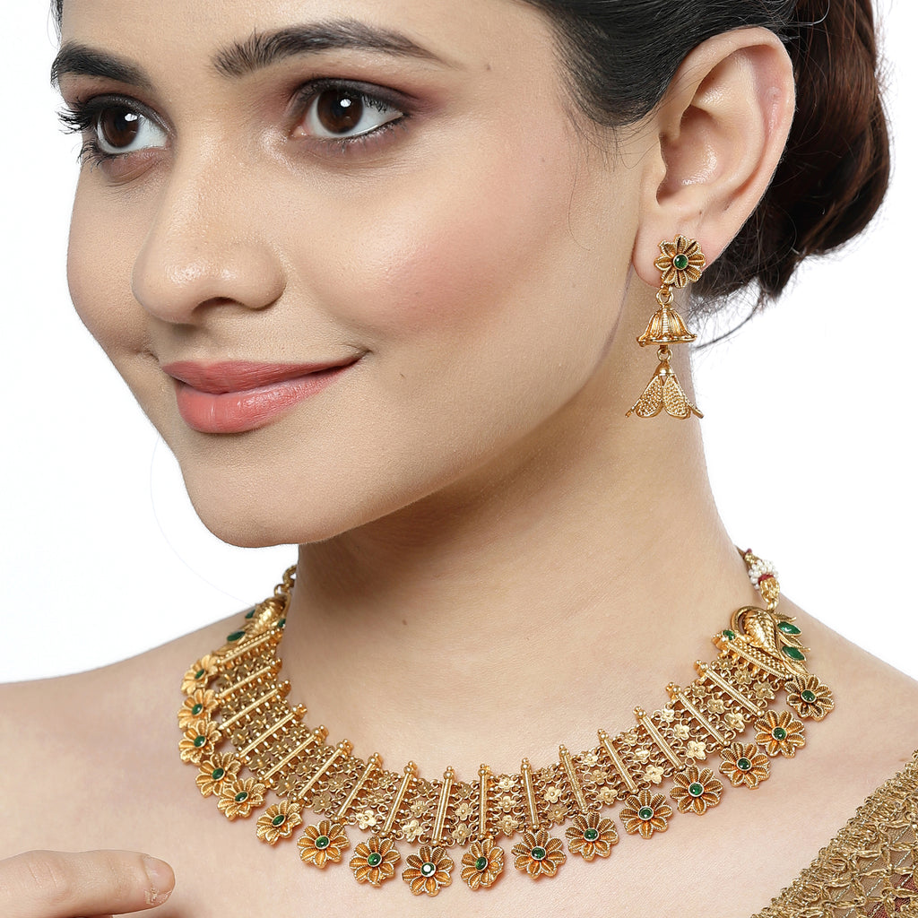 Gold-Plated Floral Design Green Artificial Stones Studded and Beads Beaded Jewellery Set