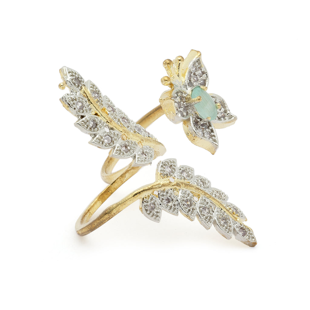 Gold-Plated Flower & Leaf Shaped Sea Green Cubic Zirconia Studded Ring