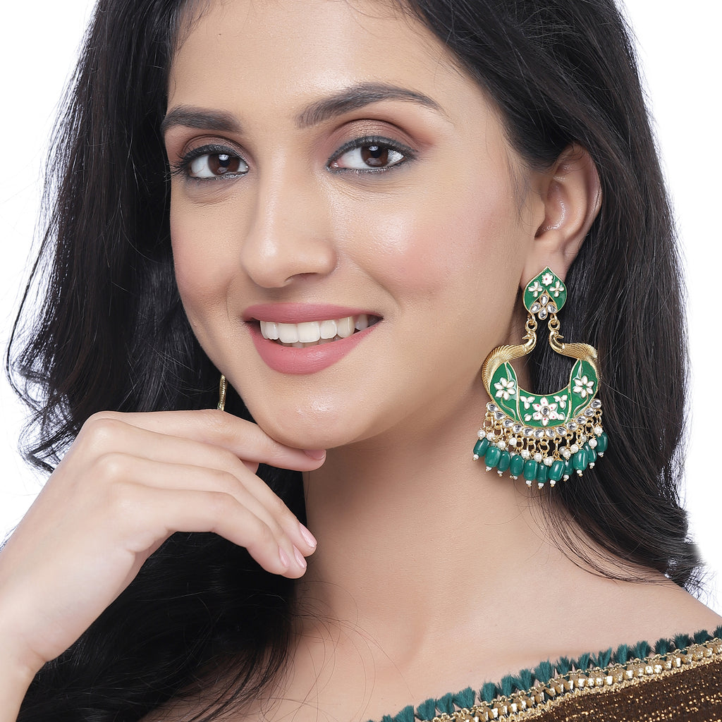 Gold-Plated Green & White Peacock Shaped Handcrafted Drop Earrings, has Kundan & Pearls studded secured with Post and Back closure.