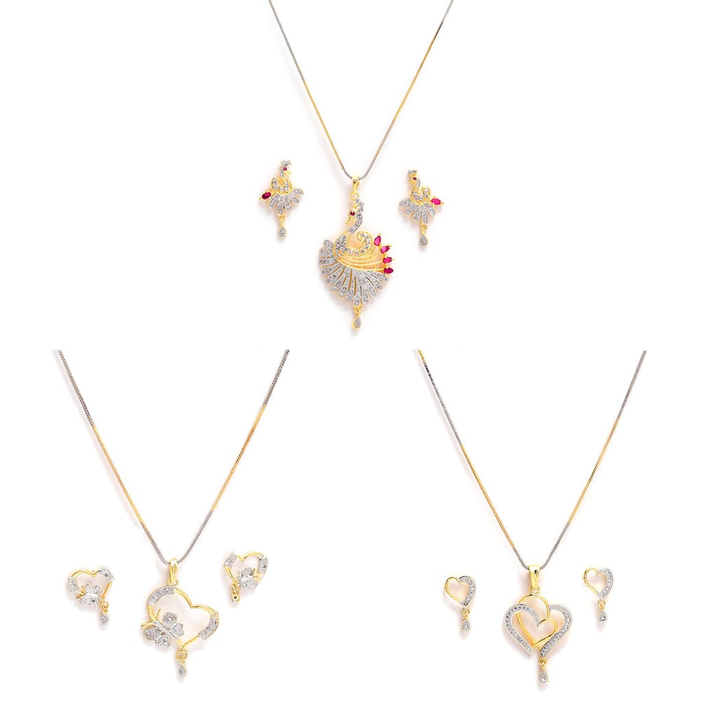 Elegant Design: Enhance your jewelry collection with this stunning pendant set assortment, featuring exquisite designs in gold plating. This elegant collection includes multiple pendant styles with matching earrings, each adorned with cubic zirconia stones