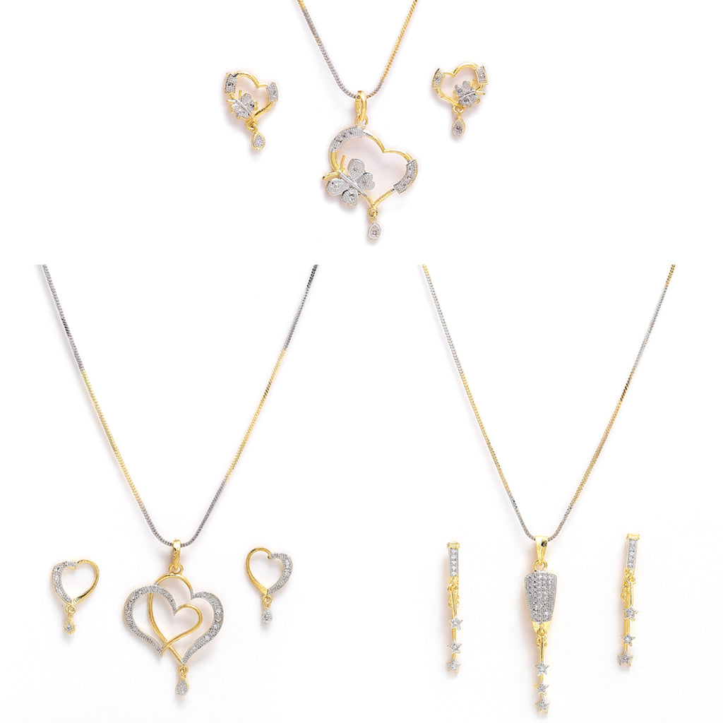 Elegant Design: Enhance your jewelry collection with this stunning pendant set assortment, featuring exquisite designs in gold plating. This elegant collection includes multiple pendant styles with matching earrings, each adorned with cubic zirconia stones