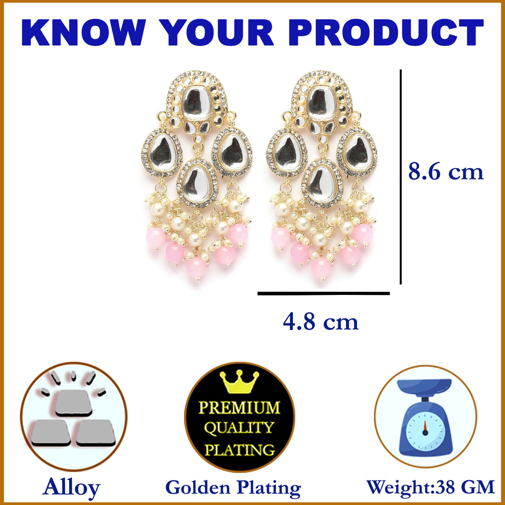 Gold-Plated Kundan & Pink Pearls studded Teardrop Shaped Mirror Drop Earrings