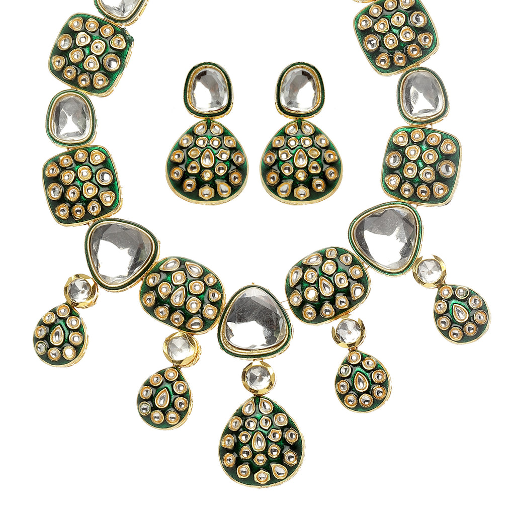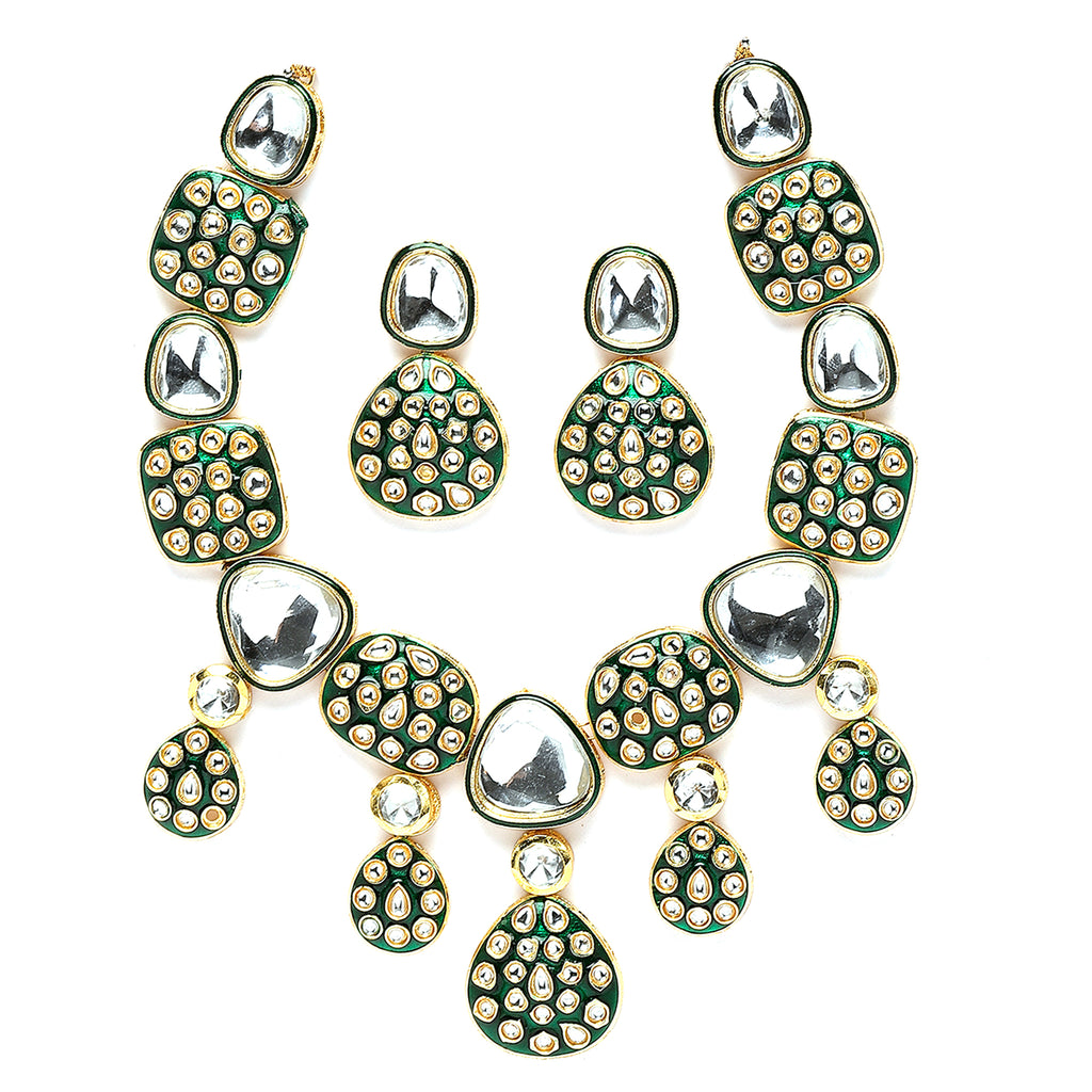 Gold-Plated Kundan Studded Green Enamelled Necklace With Earrings Jewellery Set
