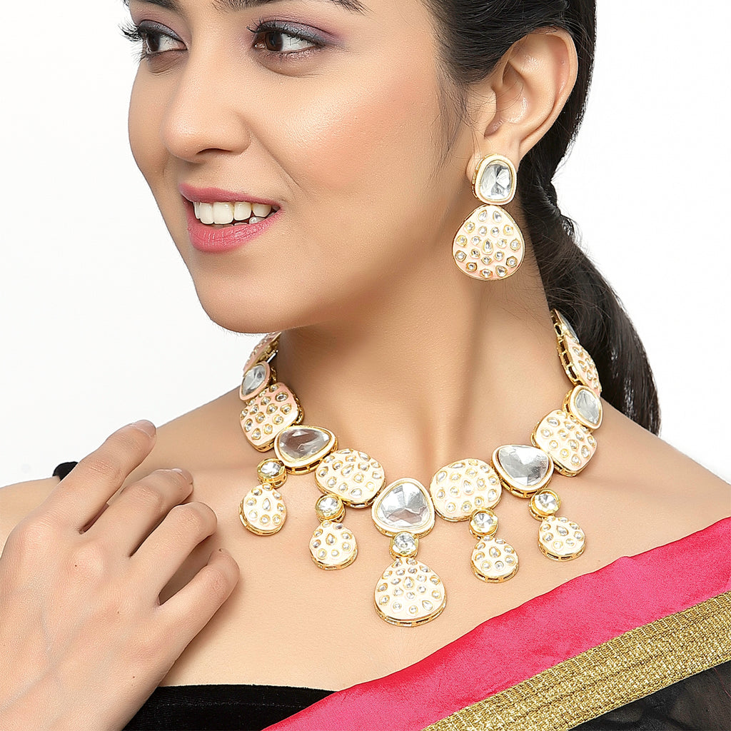 This jewellery set consists of a necklace and a pair of earrings. Gold-Plated kundan studded pink & white enamelled necklace, secured with adjustable drawstring closure. A pair of matching drop earrings, each secured with a post and back closure.
