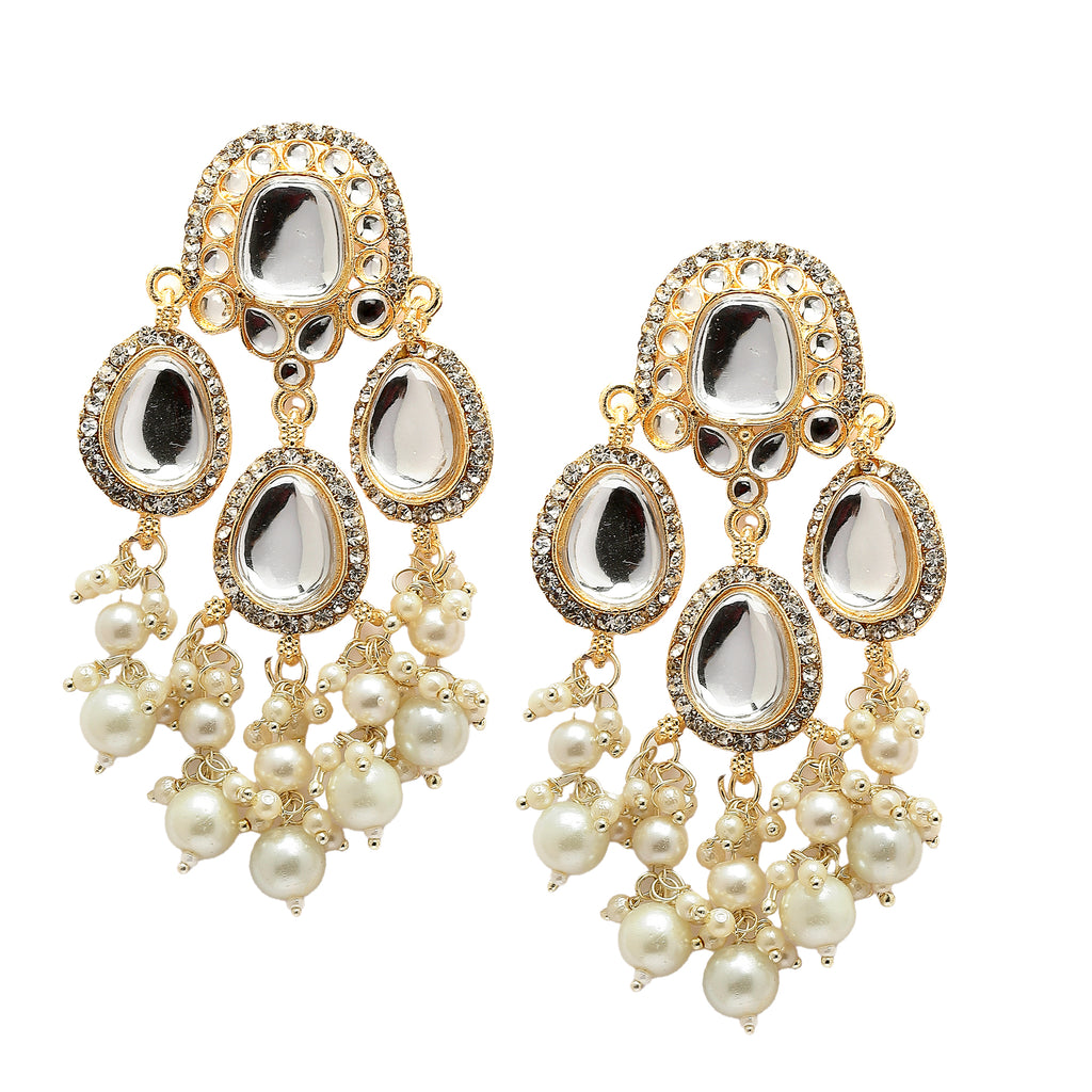 Gold-Plated Kundan & White Pearls studded Teardrop Shaped Mirror Drop Earrings