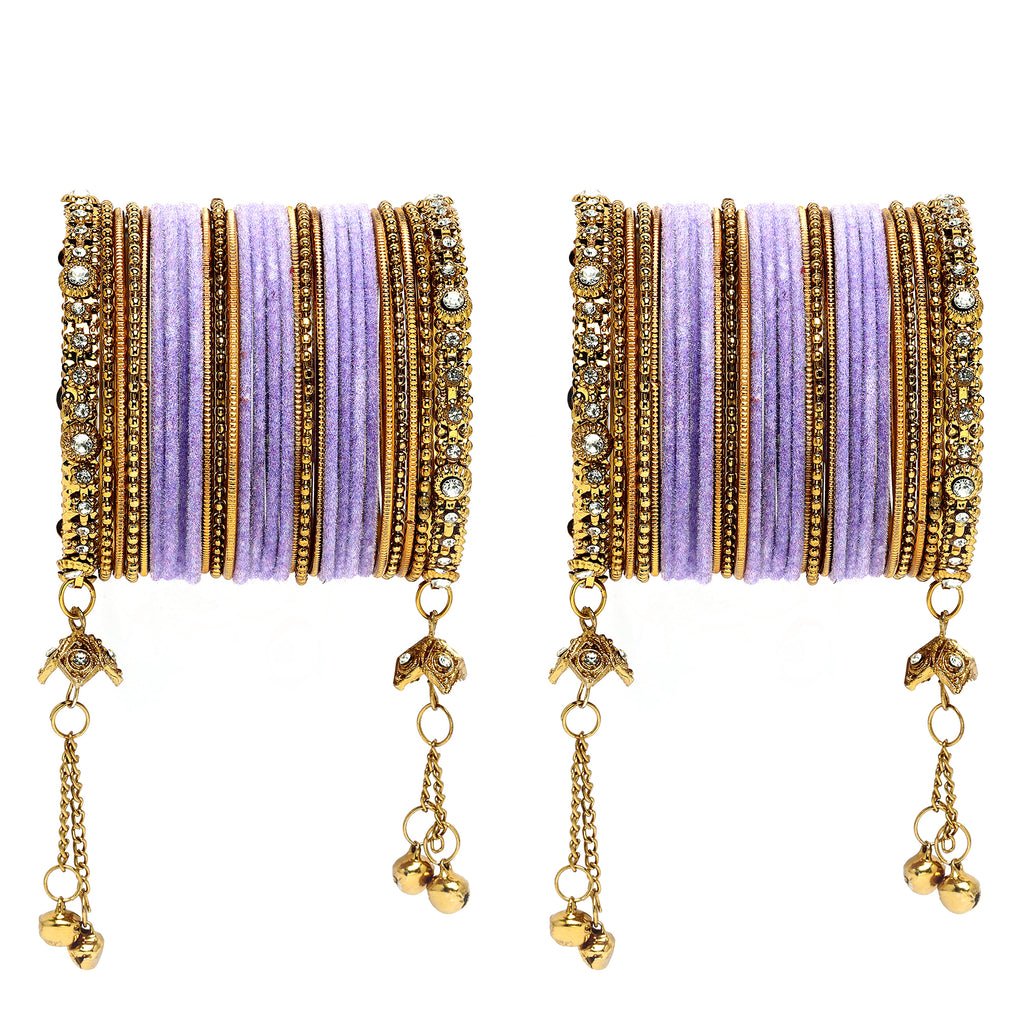 Elegant Design: Elegant bangle set featuring violet matte finish velvet, gold-tone metal accents, and stone-studded bangles. Finished with delicate dangling charms, this set blends tradition with a modern pastel touch