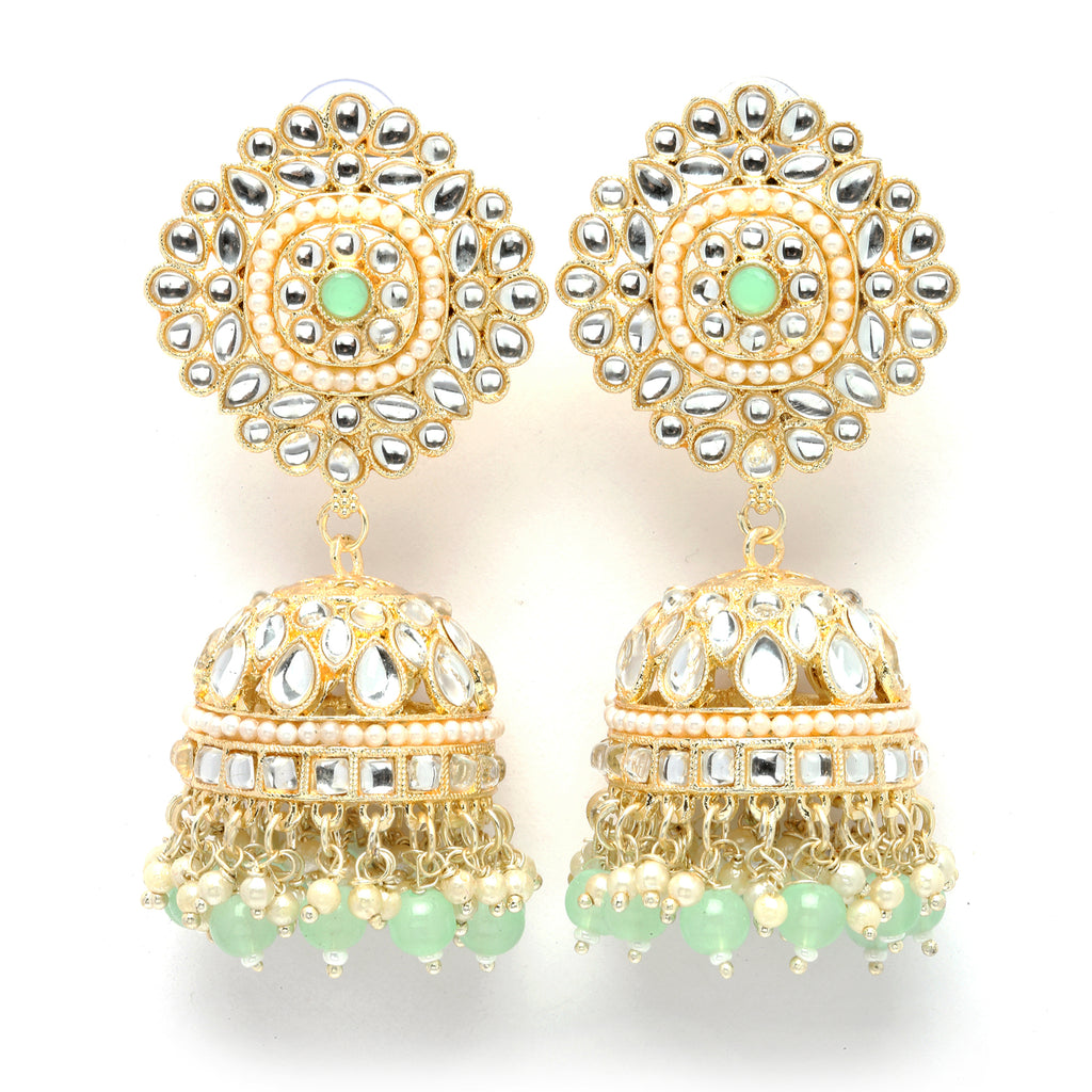 Gold-Plated Sea Green & White Kundan-Pearls studded Vilandi Jhumka Earrings