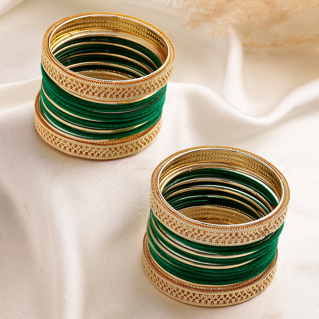 Elegant Design: Elegant bangle set featuring matte finish green velvet, gold-tone metal accents, and textured bangles. This set blends tradition with a modern pastel touch