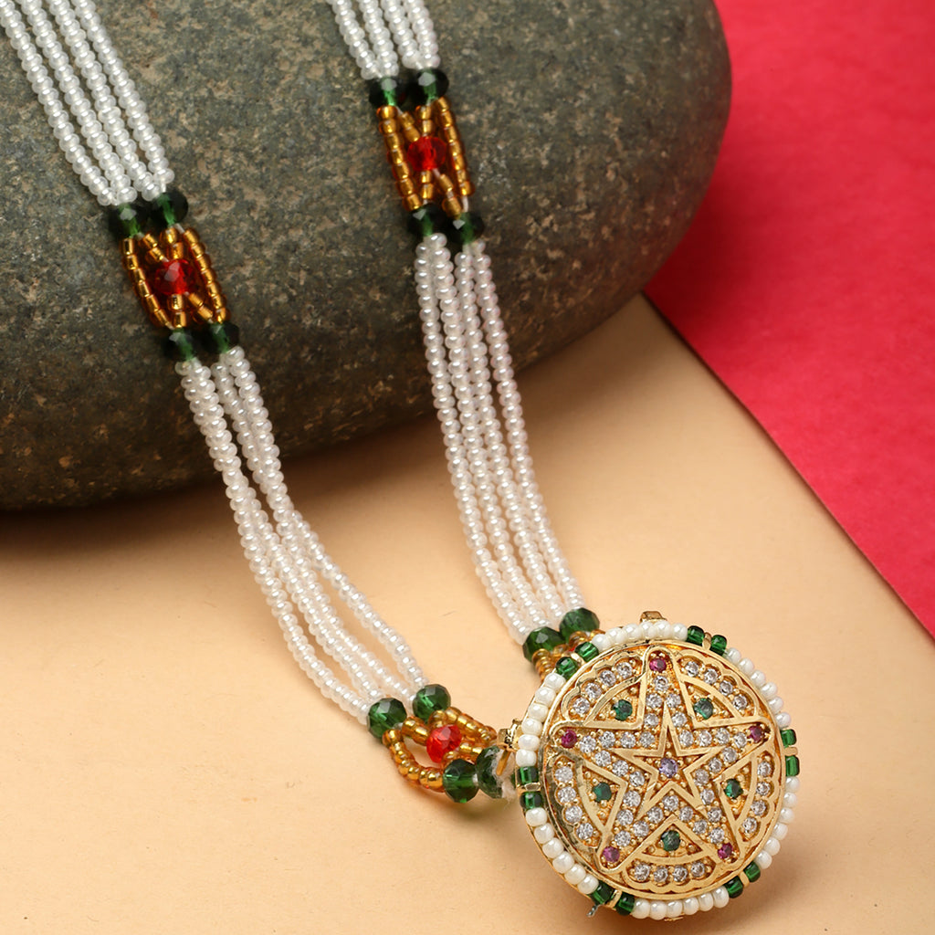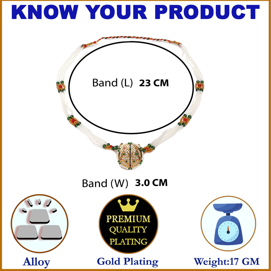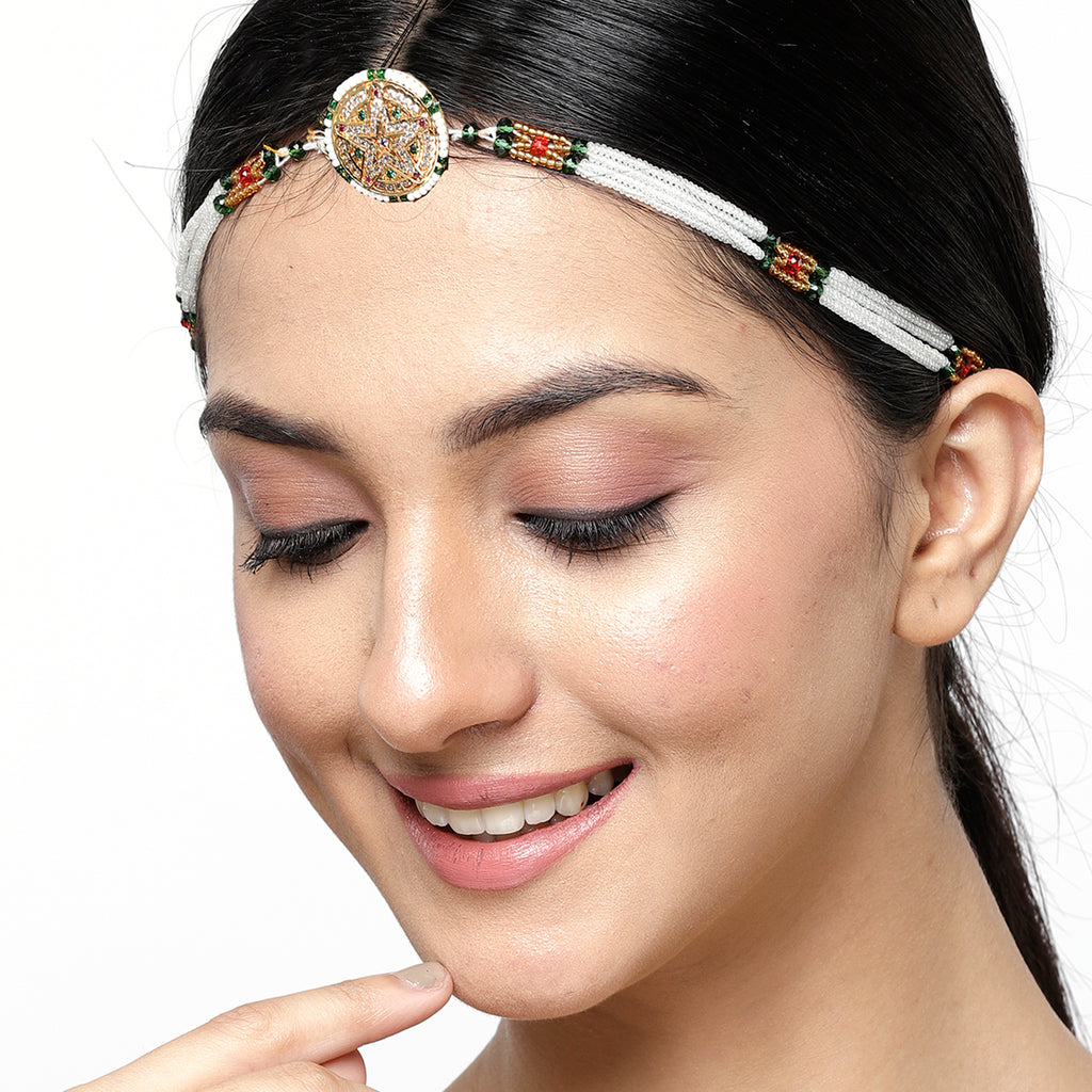 Elegant Design: This elegant headpiece showcases a traditional Rajasthani Borla design with a round, dome-shaped adorned with intricate Kundan work, pearls, and vibrant red and white accents.