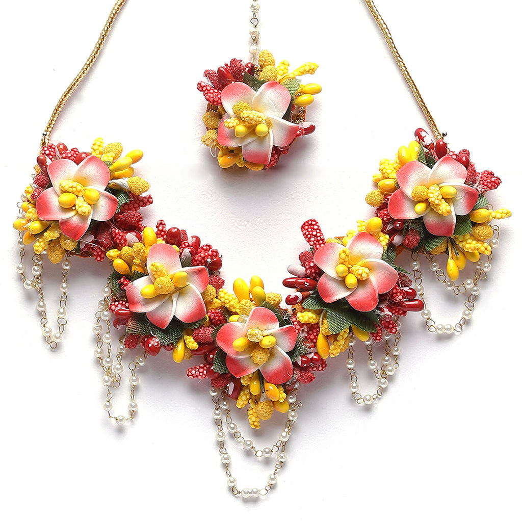 Gold-Plated Multi-Colour Floral White Pearls Beaded Haldi & Mehendi Jewellery Set with Maang Tikka & Haathphool Ring