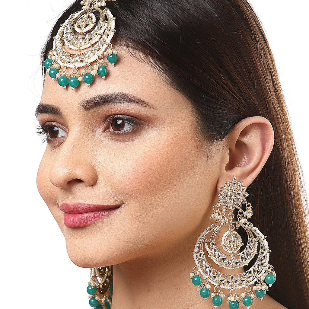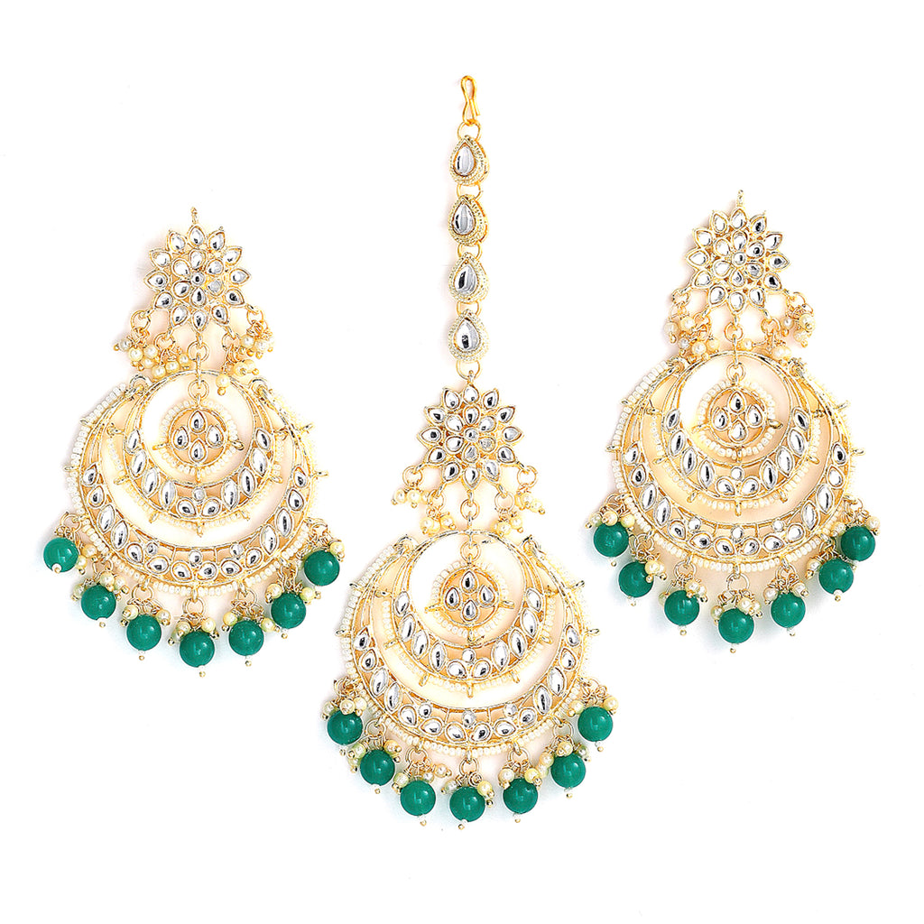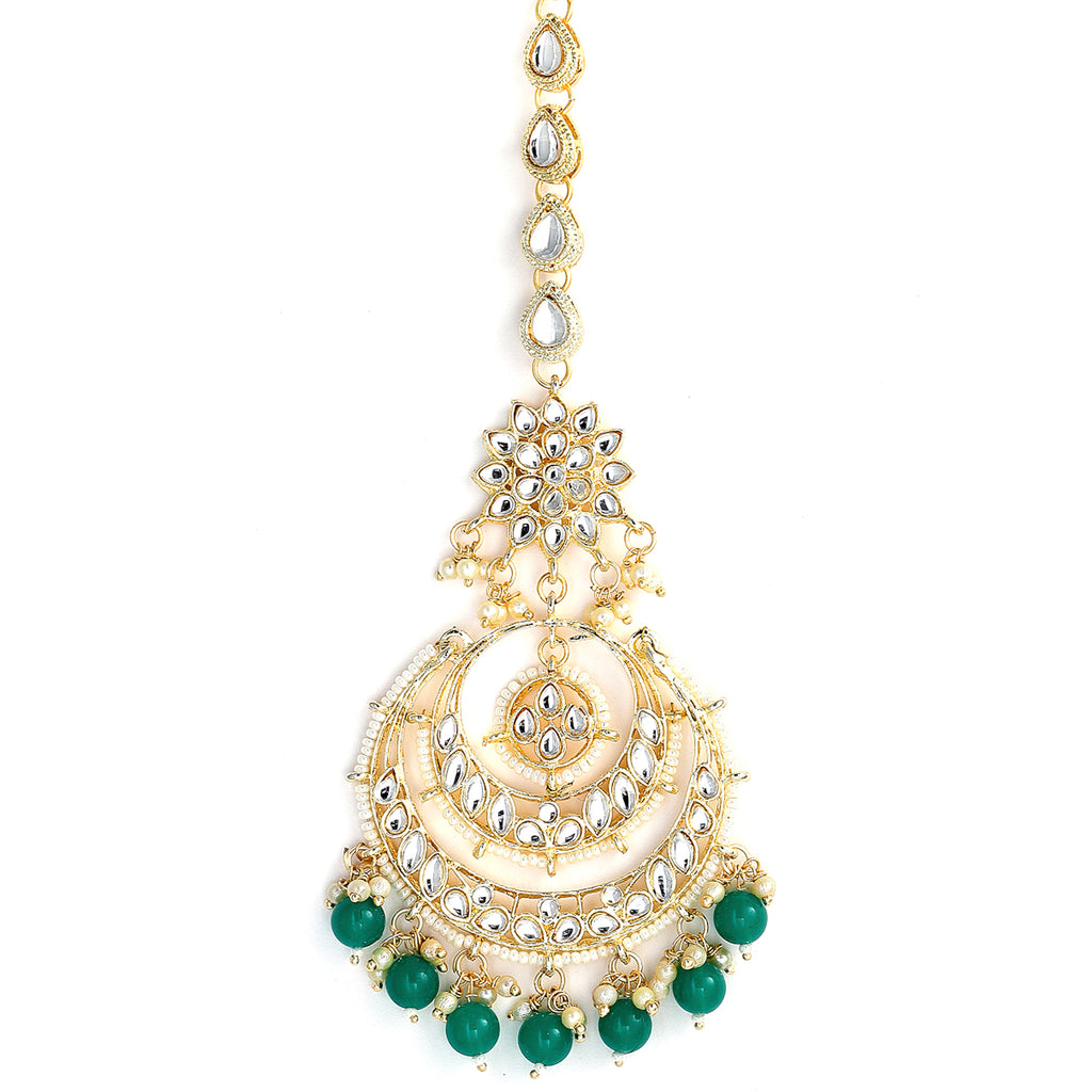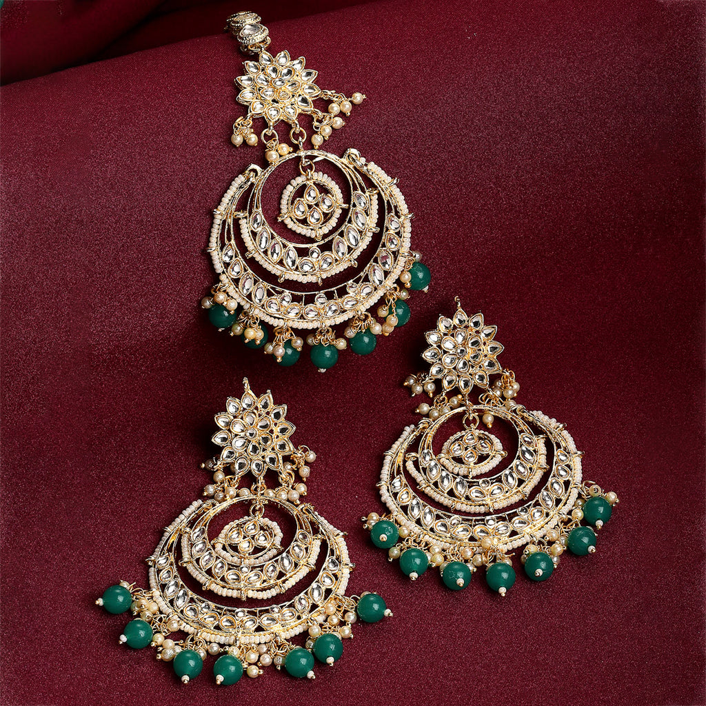 Gold-Plated Pearl Drops Green Kundan Chandbali Maang Tikka & Earrings Set