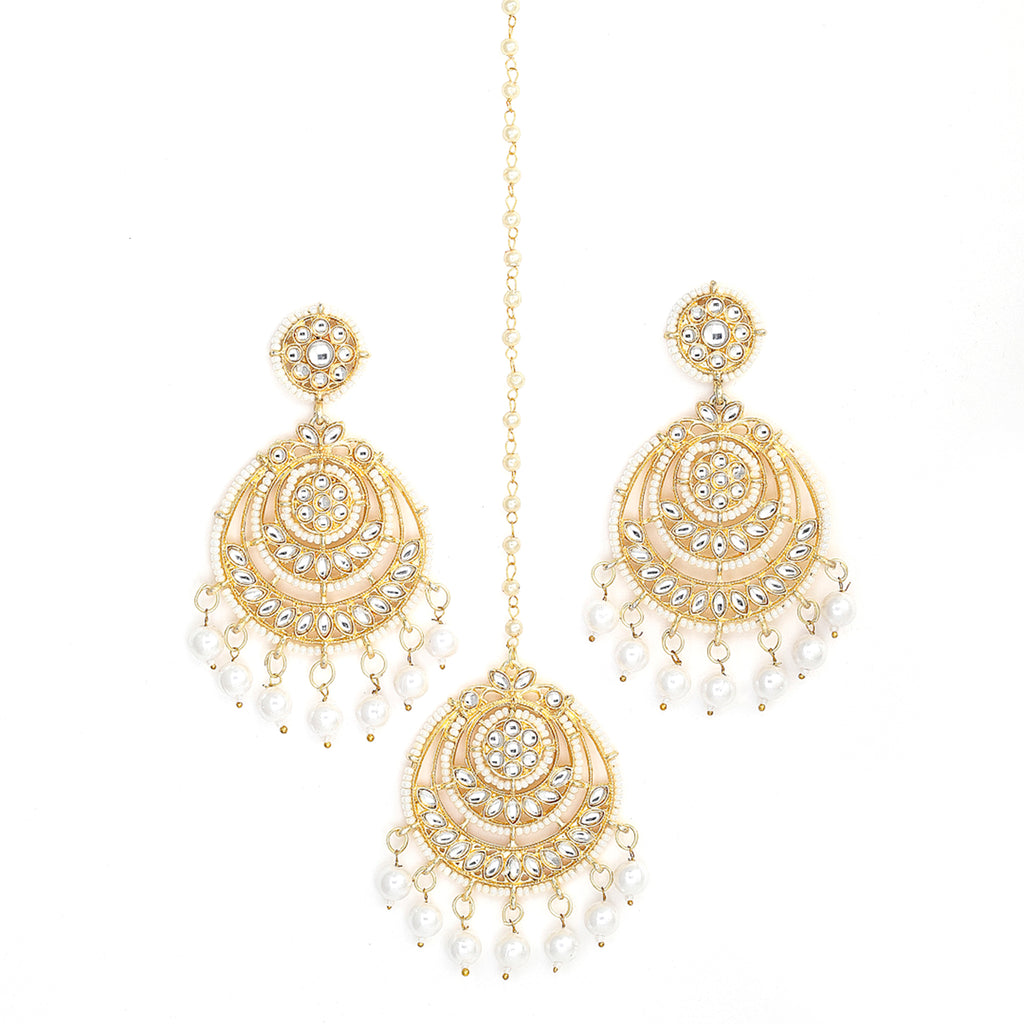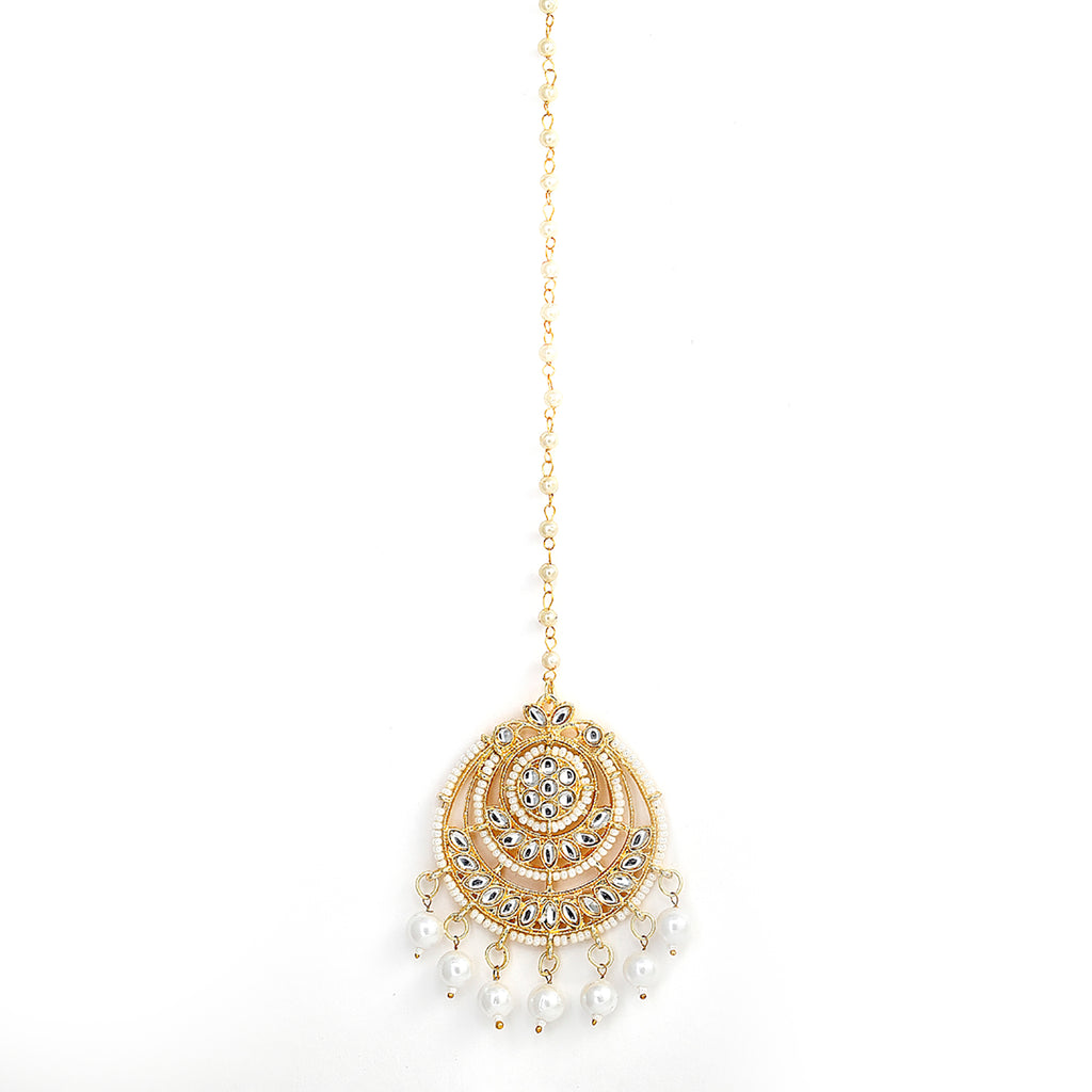 Gold-Plated Pearl Drops White Kundan Chandbali Maang Tikka & Earrings Set
