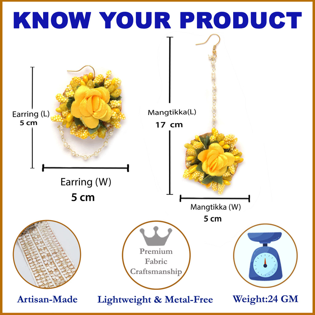 • Elegant Design: This gold plated set features handcrafted floral Maang Tikka & Earring Set, featuring vibrant artificial flowers accented with delicate pearl strands.