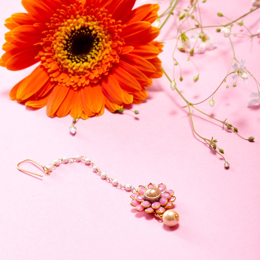 Gold-Plated Pearl Pink Gota Patti Flower Maang Tikka