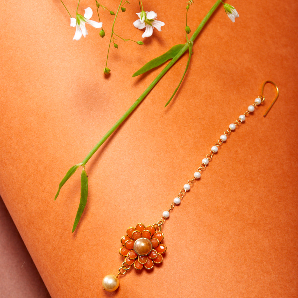 Gold-Plated Pearl Studded Orange Flower Maang Tikka
