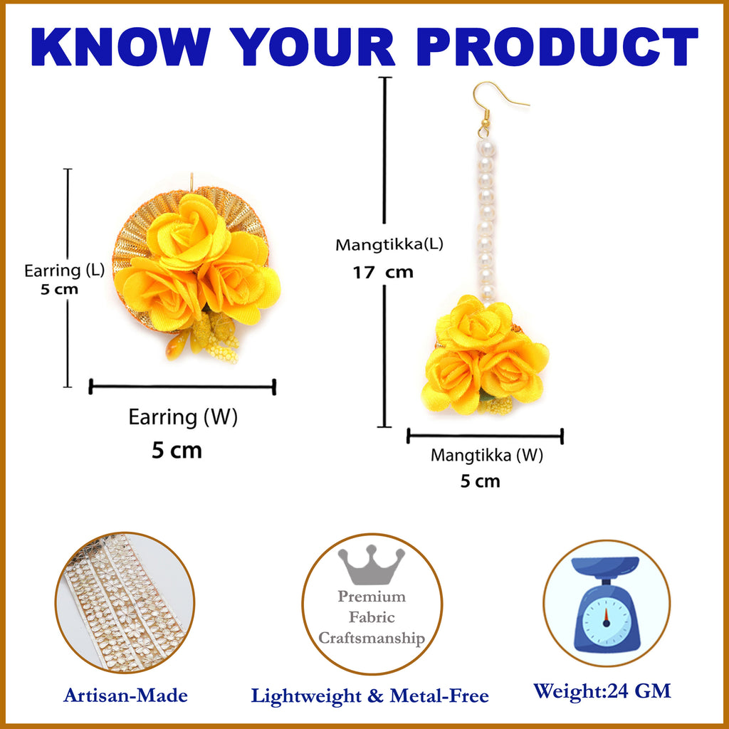 • Elegant Design: This gold plated set features handcrafted floral Maang Tikka & Earring Set, featuring vibrant artificial flowers accented with delicate pearl strands.