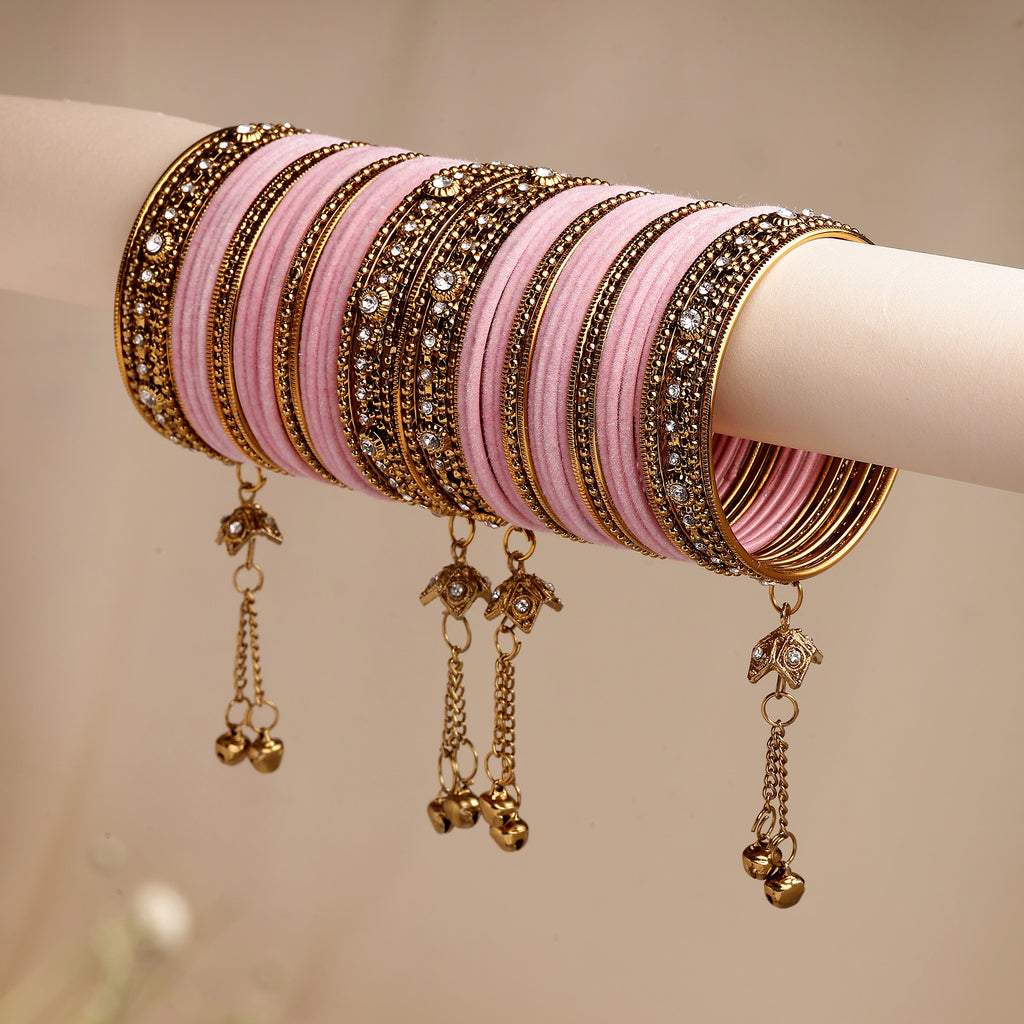 Elegant Design: Elegant bangle set featuring matte finish pink velvet, gold-tone metal accents, and stone-studded bangles. Finished with delicate dangling charms, this set blends tradition with a modern pastel touch