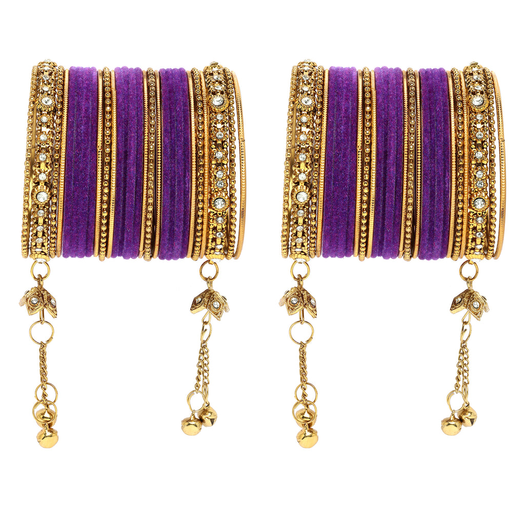 Elegant Design: Elegant bangle set featuring matte finish purple velvet, gold-tone metal accents, and stone-studded bangles. Finished with delicate dangling charms, this set blends tradition with a modern pastel touch