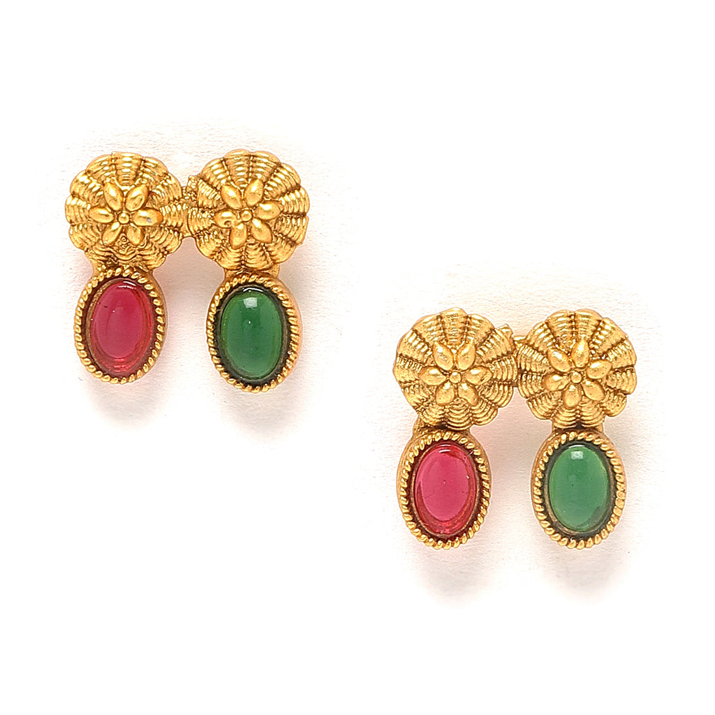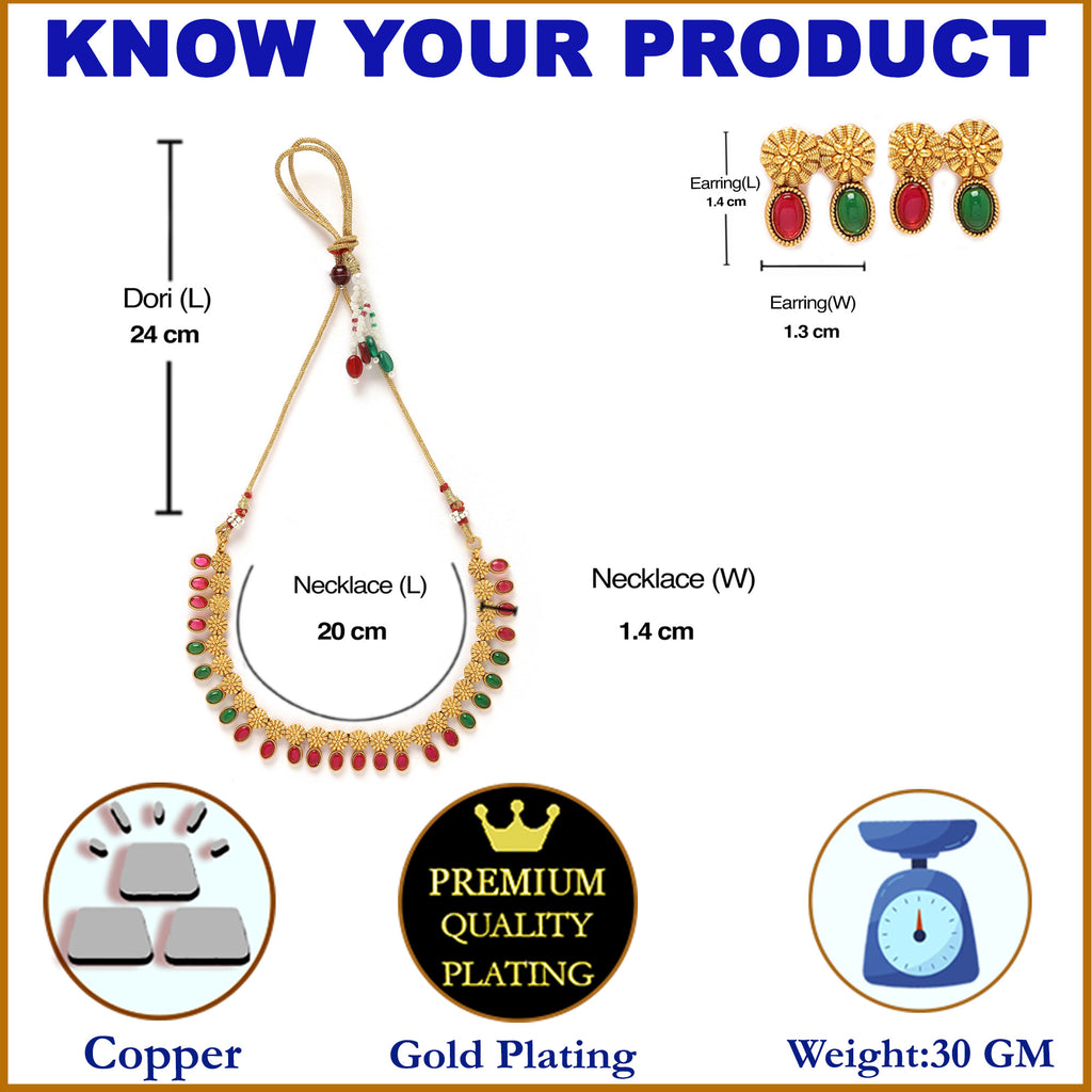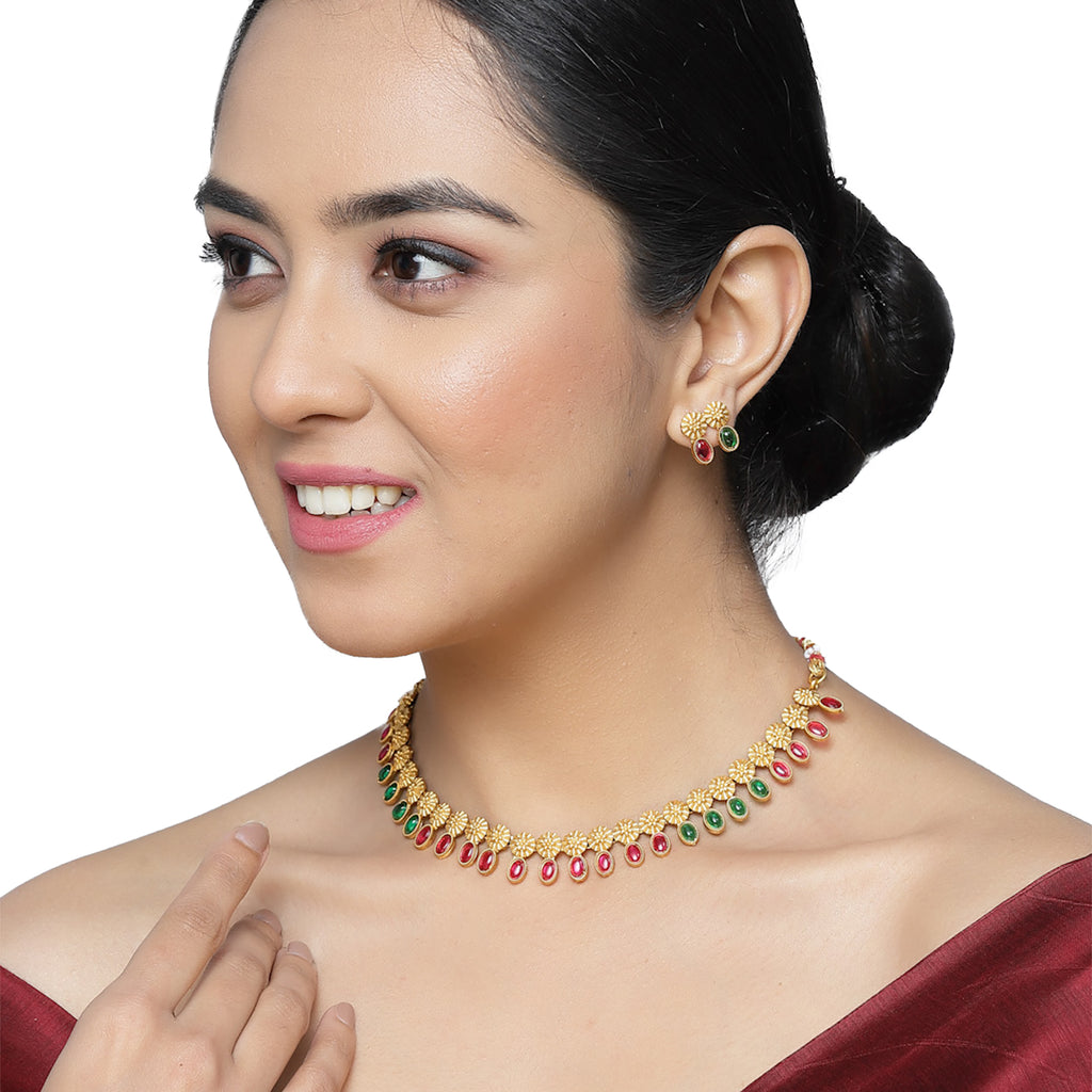 This jewellery set consists of a necklace and a pair of earrings. Gold-Plated red & green cubic zirconia studded floral theme necklace, secured with adjustable drawstring closure. A pair of matching drop earrings, each secured with a post and back closure.
