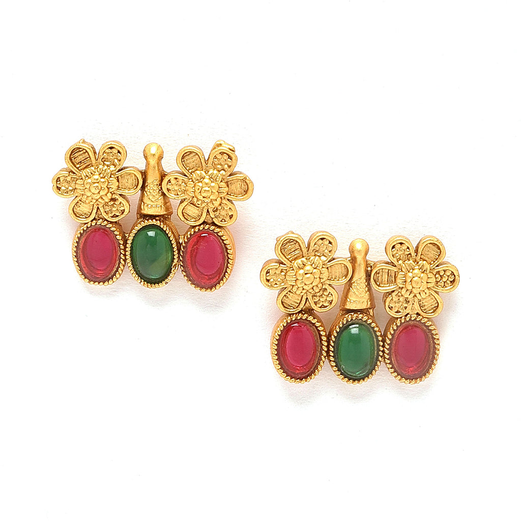 Gold-Plated Red & Green Cubic Zirconia Studded Florweret Theme Jewellery Set