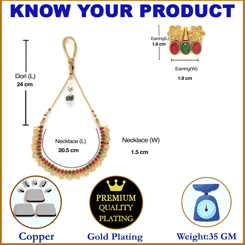 This jewellery set consists of a necklace and a pair of earrings. Gold-Plated red & green cubic zirconia studded florweret theme necklace, secured with adjustable drawstring closure. A pair of matching drop earrings, each secured with a post and back closure.