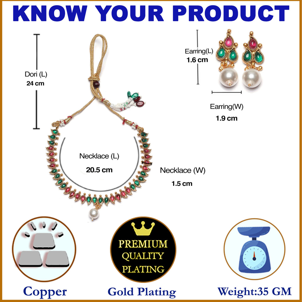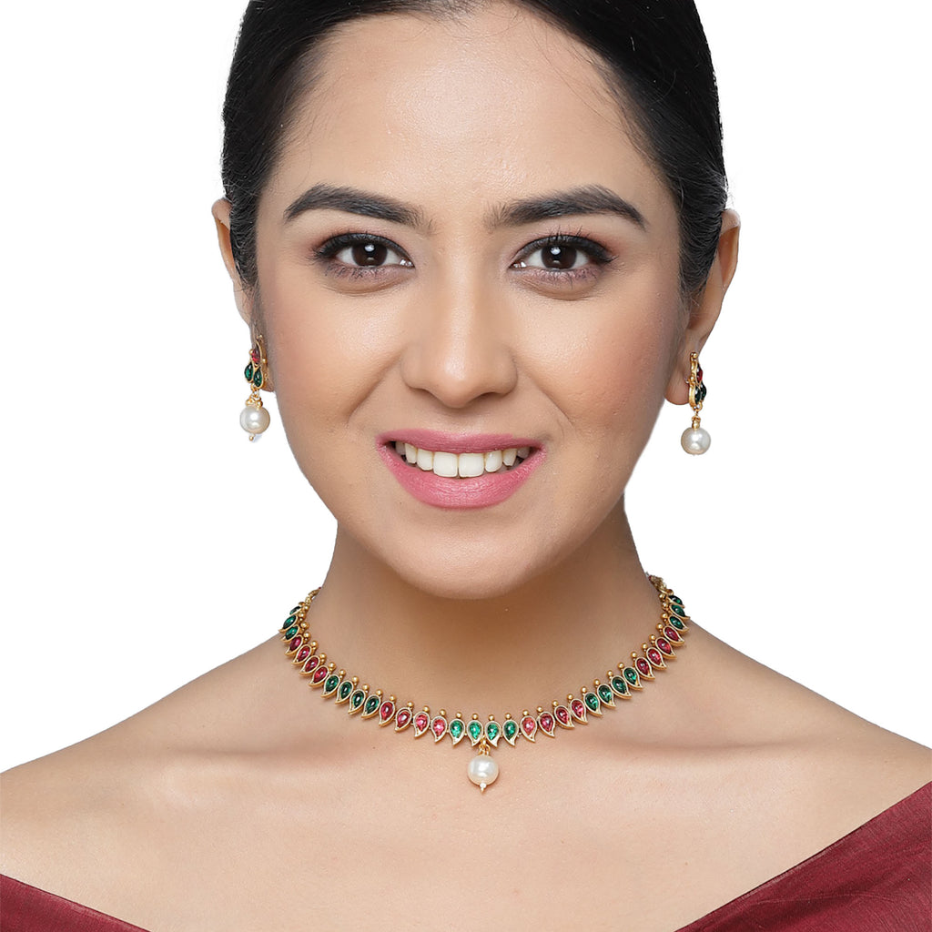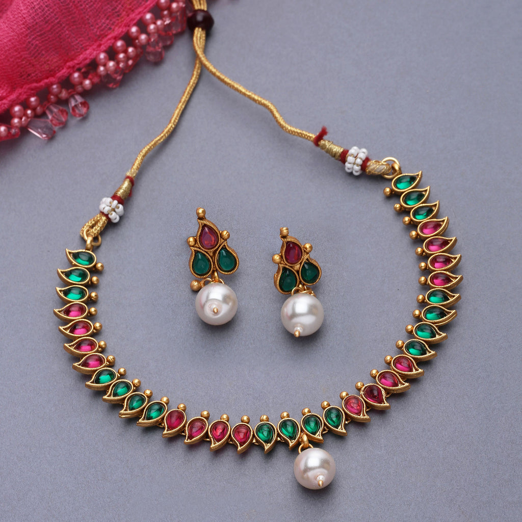 This jewellery set consists of a necklace and a pair of earrings. Gold-Plated red & green cubic zirconia white pearl studded paisley shaped necklace, secured with adjustable drawstring closure. A pair of matching drop earrings, each secured with a post and back closure.