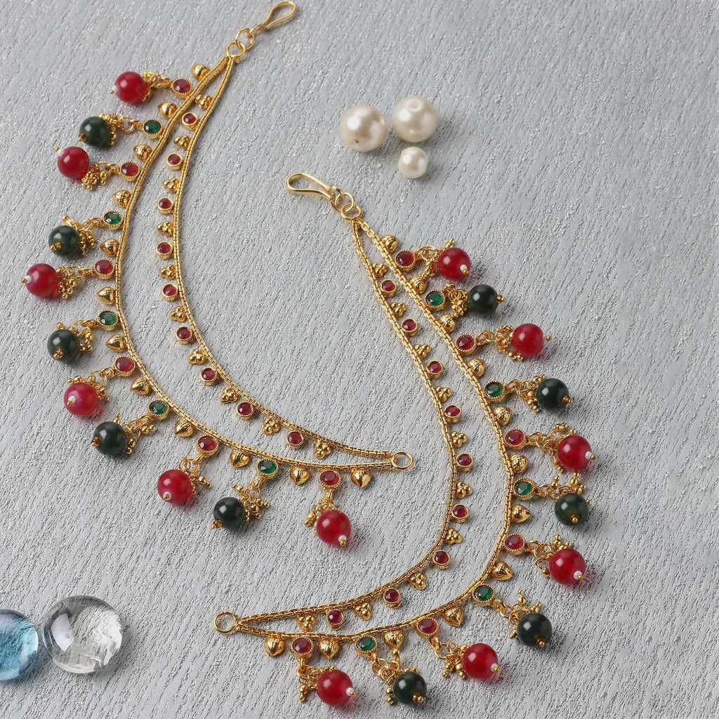 Gold-Plated Red & Green Classic Jhumka Earrings with Ear Chain, has Kundan & Pearls studded secured with Wrap closure.