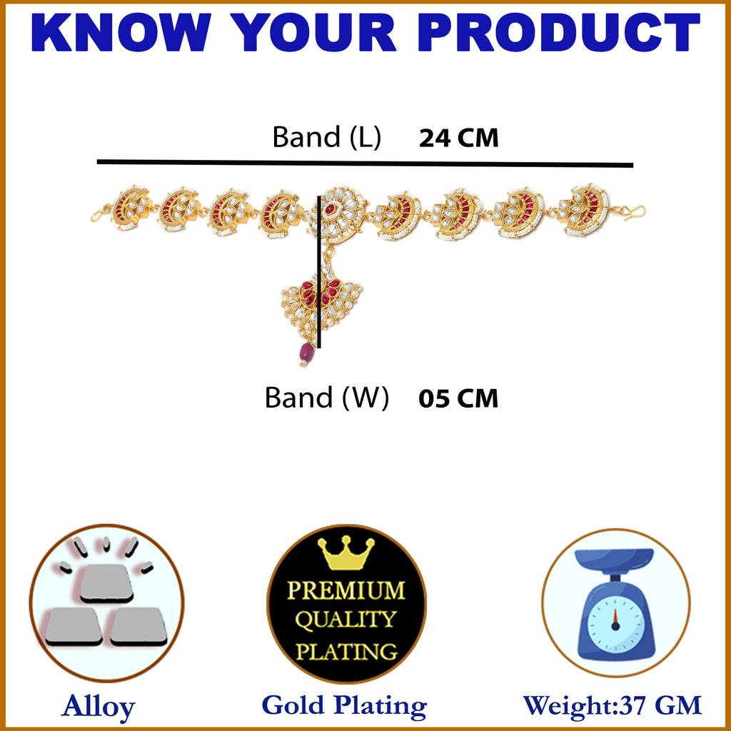 Elegant Design: Traditional crescent-motif design, enriched with intricate Kundan and pearl embellishments, beautifully highlights the contrast of ruby-red and white stones, exuding a royal and vintage charm