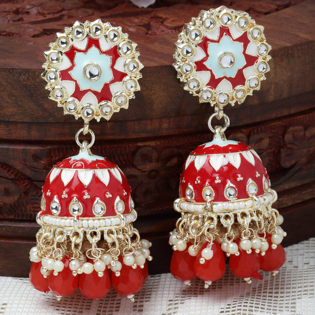 Gold-Plated Red & White Dome Shaped Handcrafted Jhumka Earrings, has Kundan & Pearls studded secured with Post and Back closure.