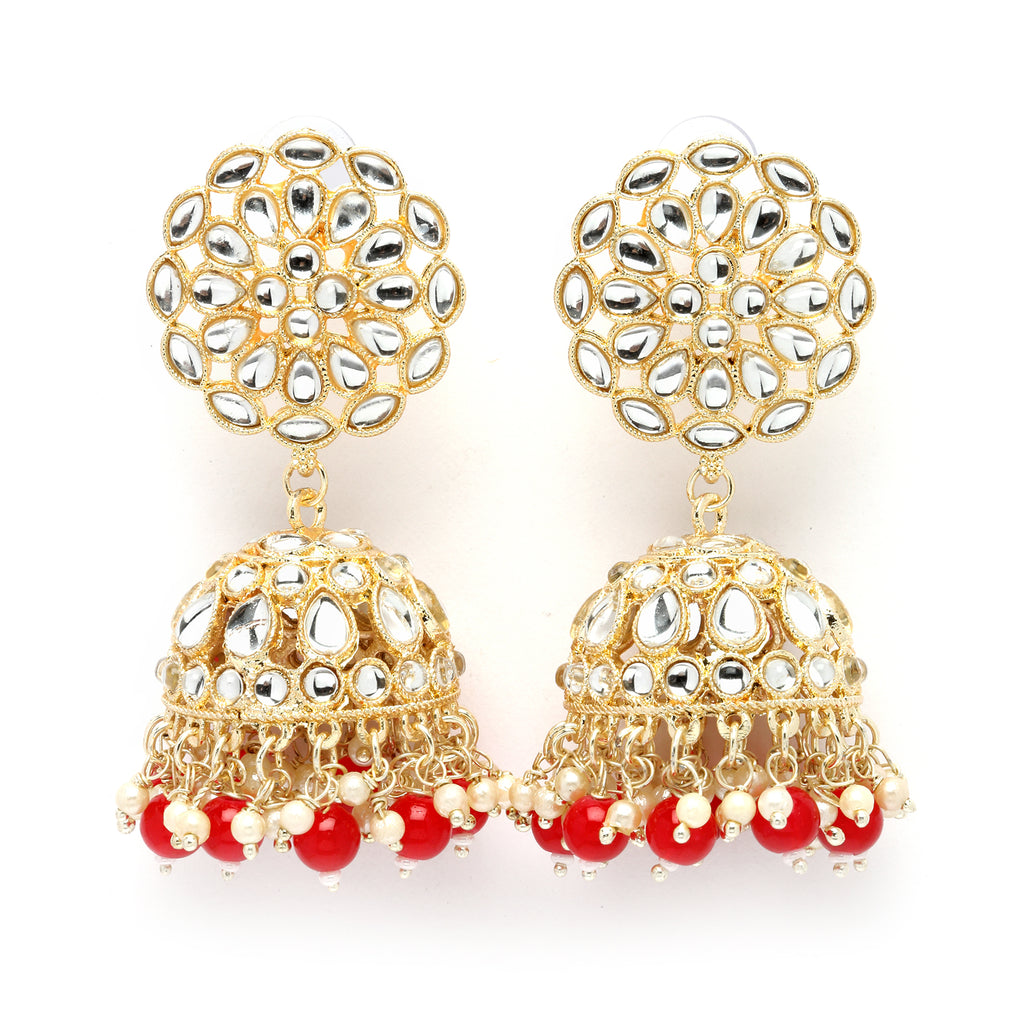 Gold-Plated Red Kundan & White Pearls studded Flower Shaped Vilandi Jhumka Earrings