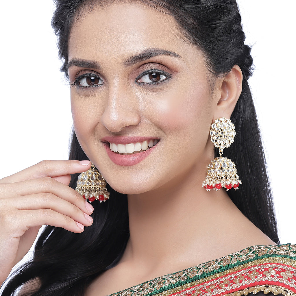 Gold-Plated Red & White Flower Shaped Vilandi Jhumka Earrings, has Kundan & Pearls studded secured with Post and Back closure.