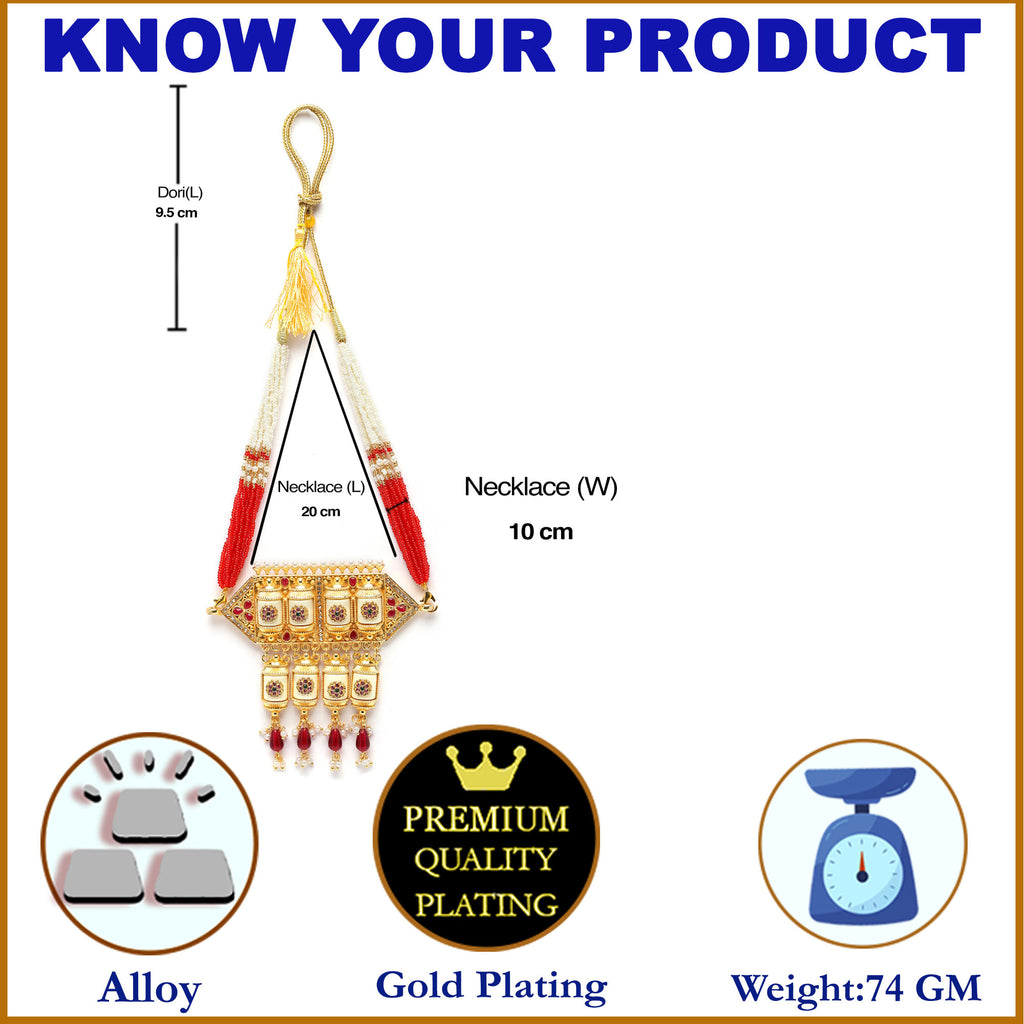 This jewellery set consists of a necklace. Gold-Plated red & white kundan studded & beaded choker meenakari necklace, has secured with a adjustable drawstring closure.