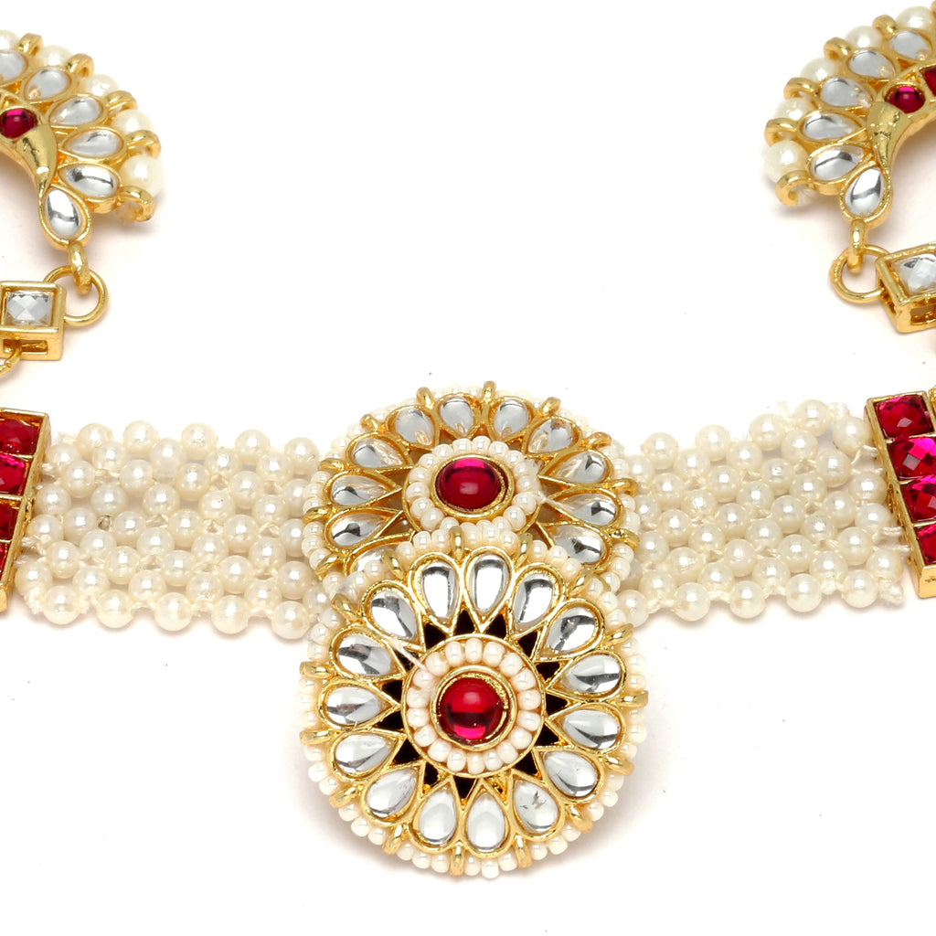 Elegant Design: This gold-plated Sheeshphool showcases an exquisite blend of Kundan work, pearl weaves, and ruby-white stone embellishments. The intricate detailing and crescent-shaped motifs add a regal charm,