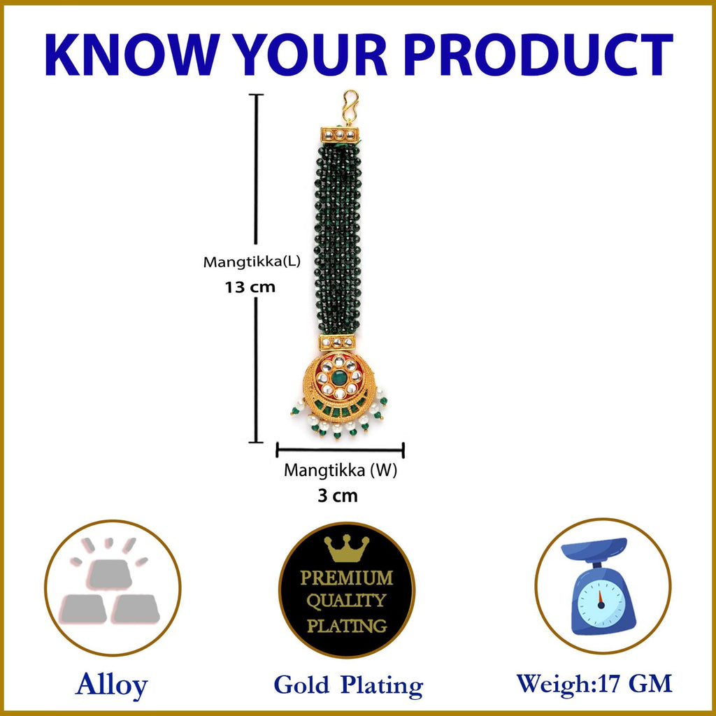 • Elegant Design: This gold-plated Kundan Maang Tikka with green beads and pearl details adds a regal touch to your ethnic wear.