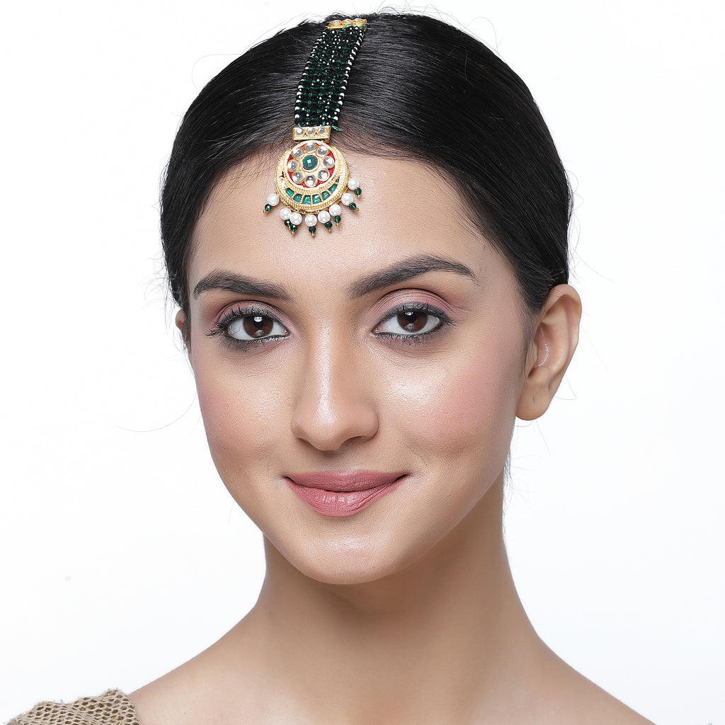 Gold-Plated Round Green Kundan & Pearl Maang Tikka