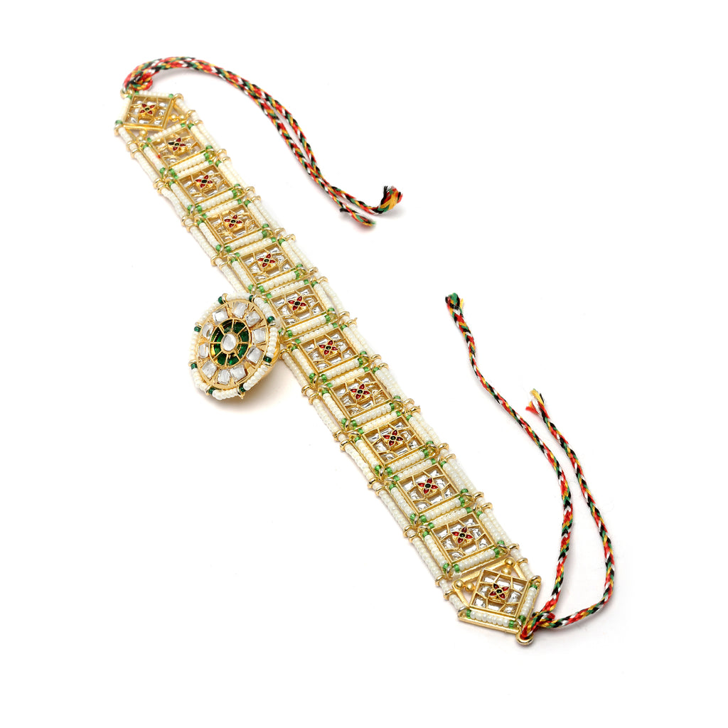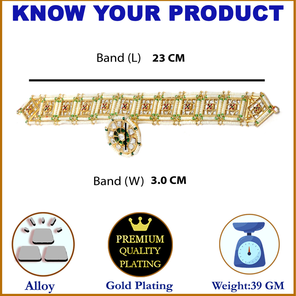 Elegant Design: This elegant headpiece showcases a traditional Rajasthani Borla design with a round, dome-shaped adorned with intricate Kundan work, pearls, and vibrant green and white accents.