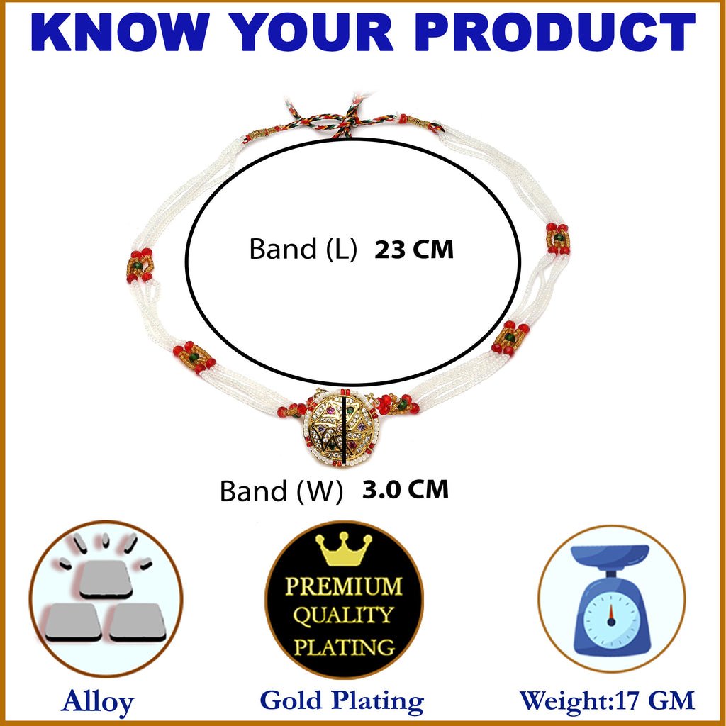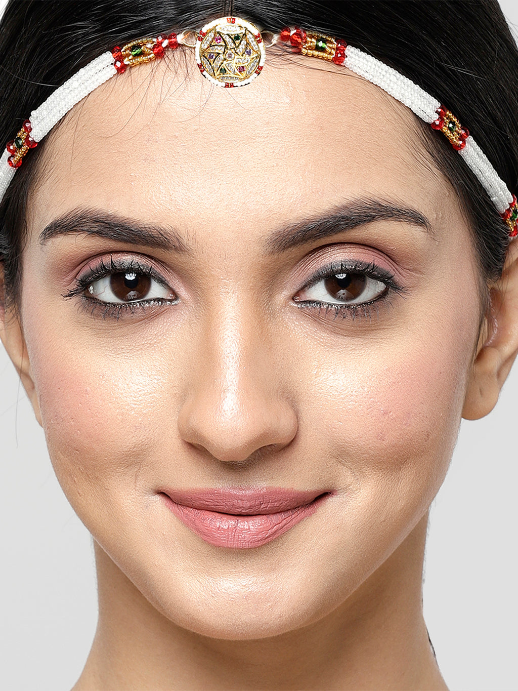 Elegant Design: This elegant headpiece showcases a traditional Rajasthani Borla design with a round, dome-shaped adorned with intricate Kundan work, pearls, and vibrant red and gold accents.