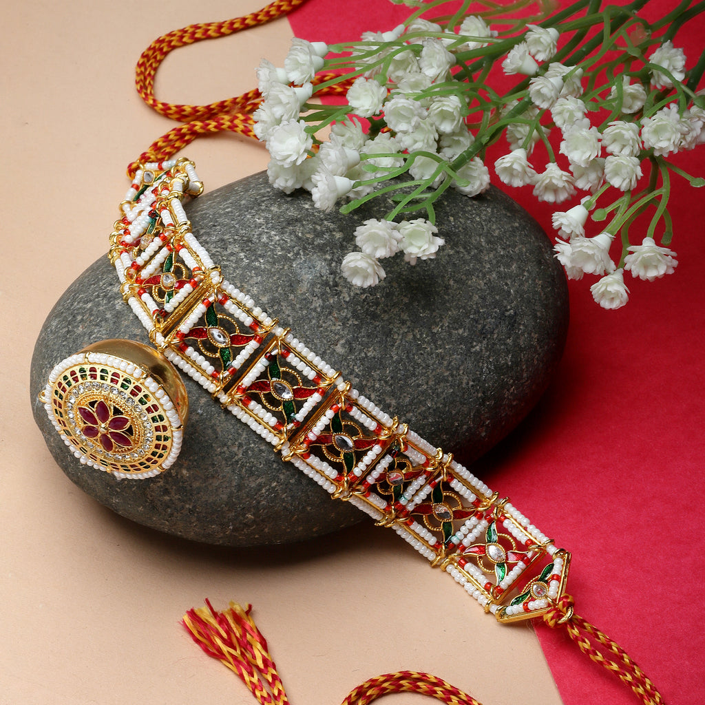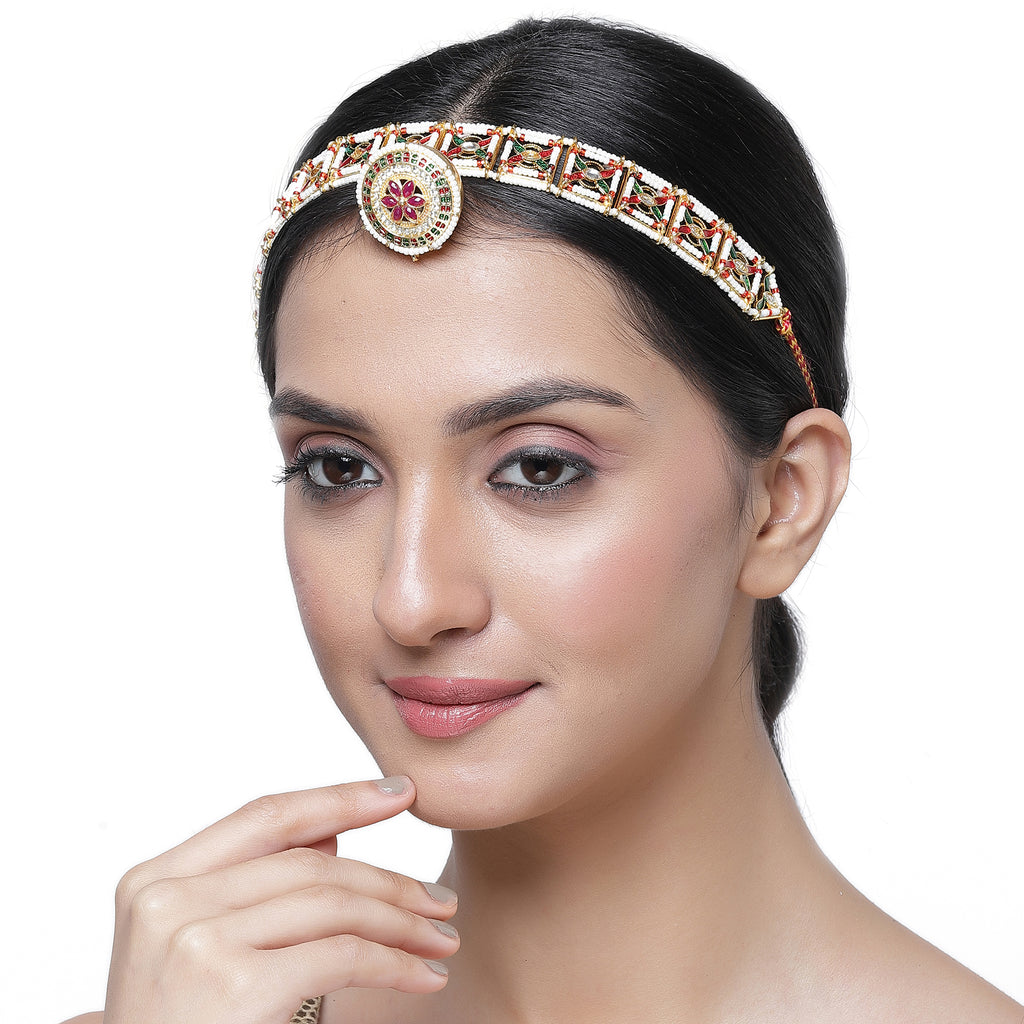 • Elegant Design: This elegant headpiece showcases a traditional Rajasthani Borla design with a round, dome-shaped adorned with intricate Kundan work, pearls, and vibrant red and white accents.