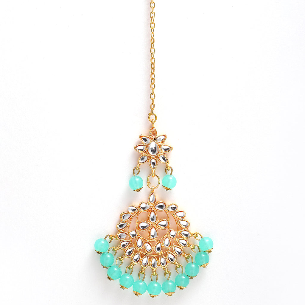 Gold-Plated Sea Green Pearl & Kundan Studded Maang Tikka With Earrings