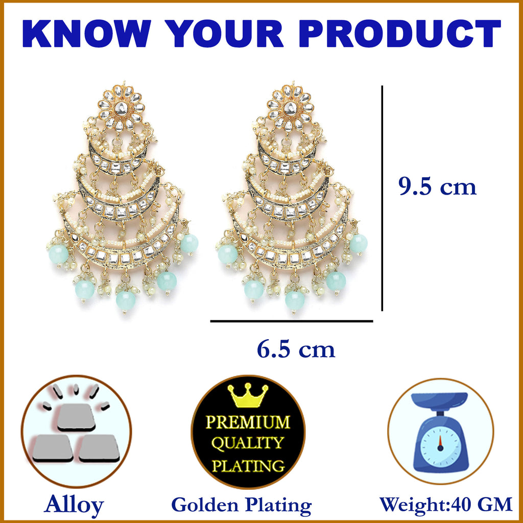 Gold-Plated Sea Green Pearls & Kundan studded Crescent Shaped Vilandi Drop Earrings