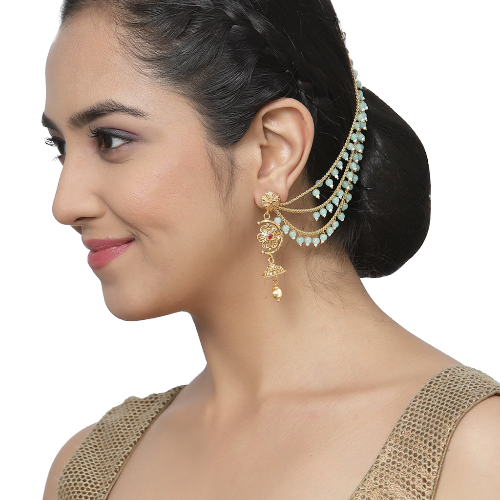 Gold-Plated Sea Green Ear Chains, has Pearls studded secured with wrap closure.